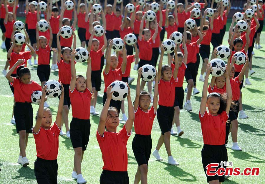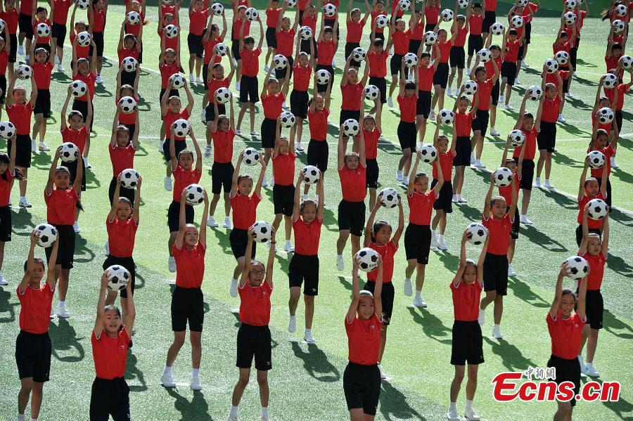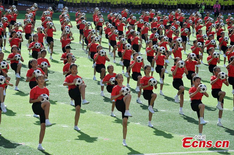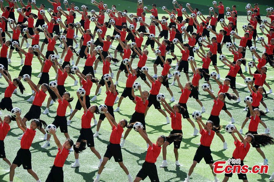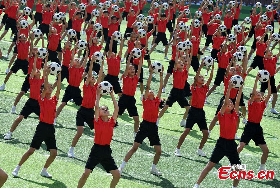 Students perform football dance during a ceremony for the China Aerobics Championship 2015 at a sports training base in Datian county, East China’s Fujian province, Aug 21, 2015. Chinese authorities have set a long-term goal of increasing the number of schools and colleges that have specialist football training facilities. (Photo: China News Service/Zhang Bin)