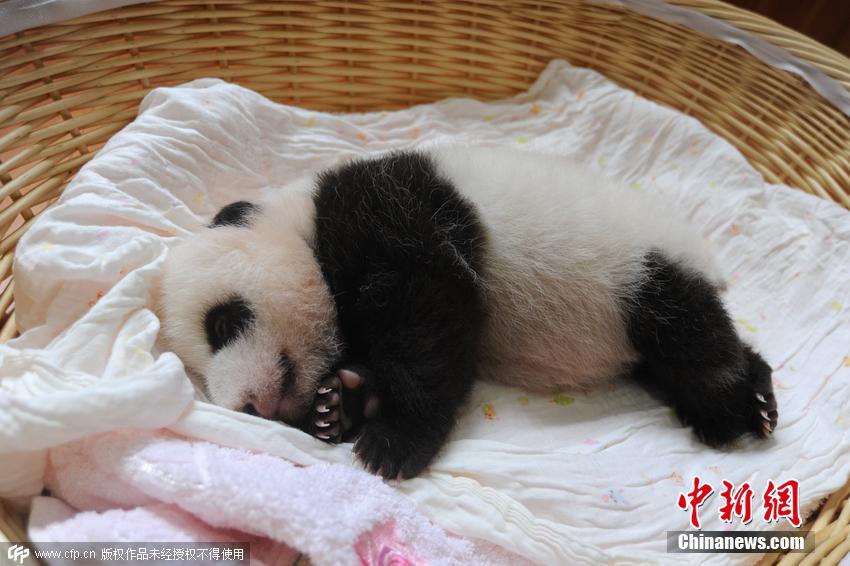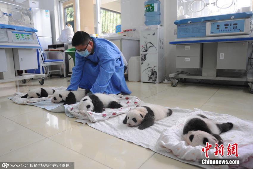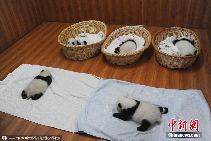 Giant panda cubs are pictured in baskets at the Ya'an Bifengxia Giant Panda Breeding and Research Center in Ya'an city, Southwest China's Sichuan province, Aug 21, 2015. It is the first time for more than 10 giant panda cubs that were born in Ya'an this year to have made their debut. The oldest is 2 months and the youngest is less than one week. (Photo/CFP)