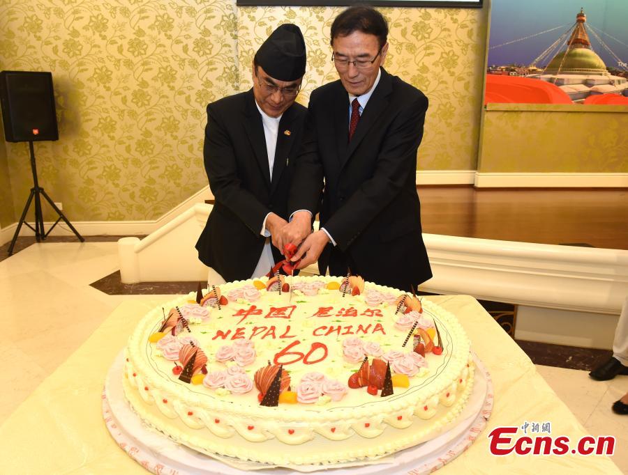 Aug. 21, Beijing, Qiangba Puncog(right), vice president of the National People's Congress of China, Mahesh Maskey, Nepali ambassador to China, are cutting a cake together, to celebrate the 60th anniversary of the establishment of diplomatic relations. (CNS photo/HOU Yu)