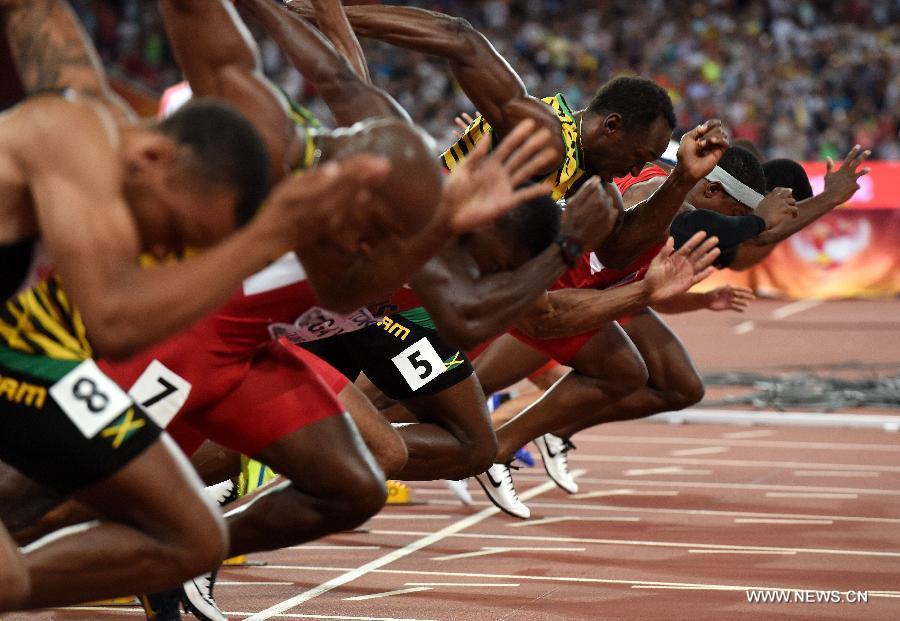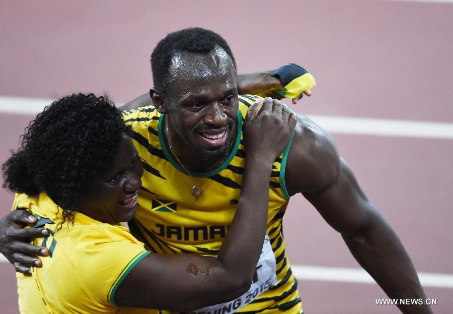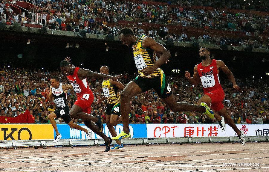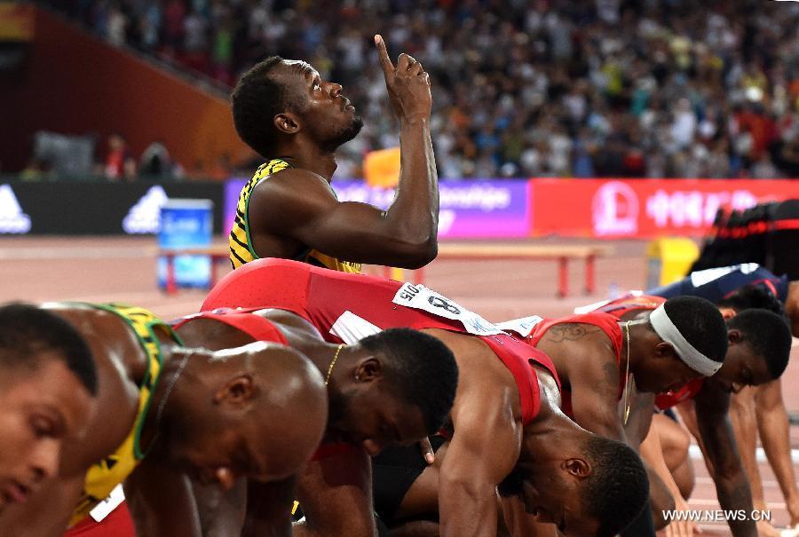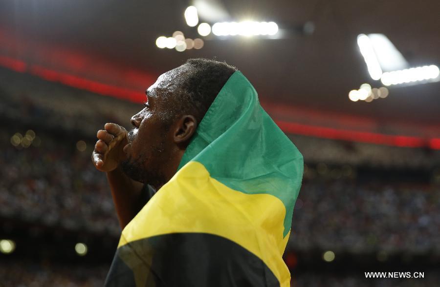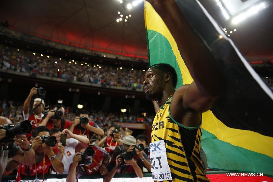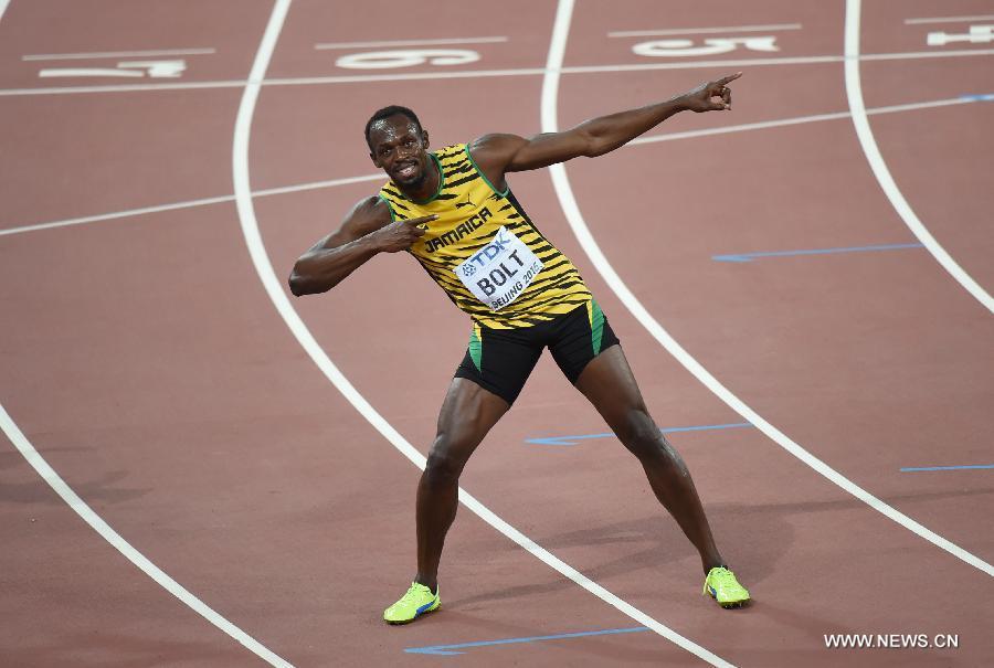 Usain Bolt of Jamaica celebrates after winning the men's 100m final at the 2015 IAAF World Championships in Beijing, capital of China, on Aug. 23, 2015. (Photo: Xinhua/Li Wen)