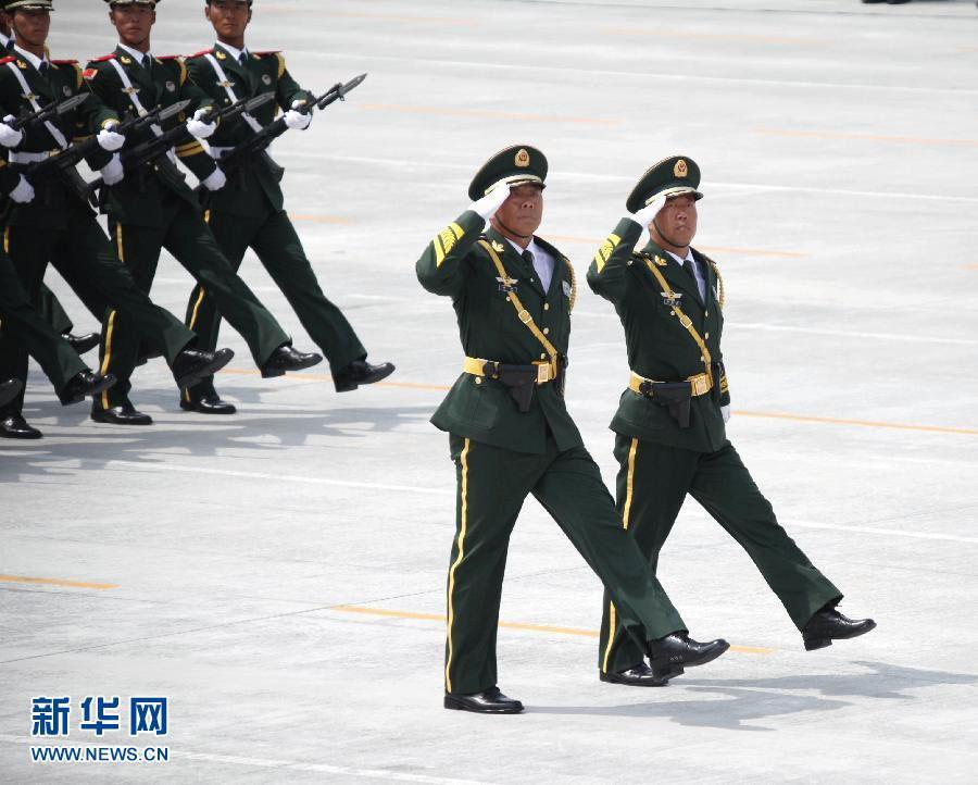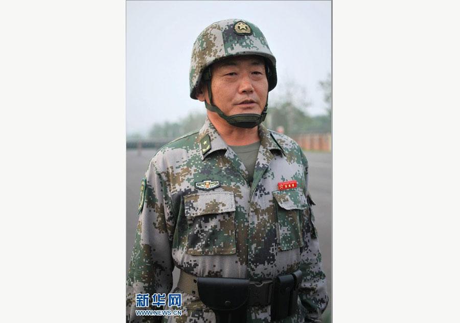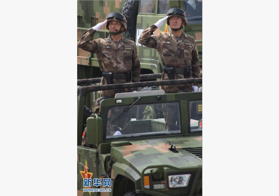 Rear Admiral Li Xiaoyan (first from left) salutes during a training session with the soldiers of a marching unit on July 30, 2015, ahead of the Sept 3 military parade to mark the 70th anniversary of victory in the War of Resistance Against Japanese Aggression. (Photo/mod.gov.cn)