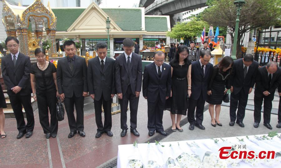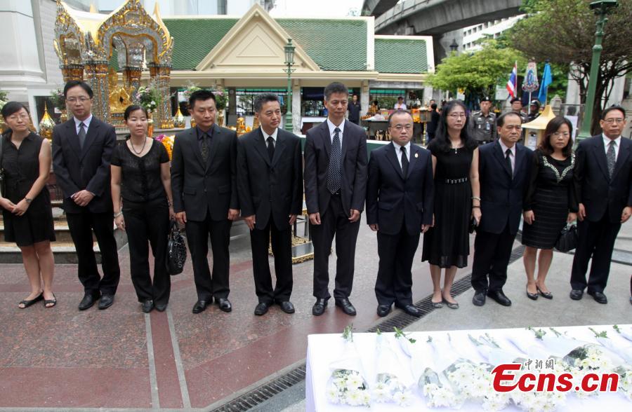 Wu Zhiwu (R,5th), the minister counselor at the Chinese embassy in Thailand, leads a delegation to pay respects for victims killed in a bomb blast at Erawan Shrine in Bangkok, Thailand, Aug 23, 2015. Sunday was the seventh day since the blast. In Chinese tradition, the seventh day since a death, known as touqi, is a special day on which people commemorate those who passed away.(Photo: China News Service/Yu Xianlun)
