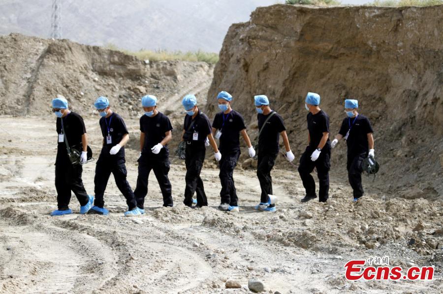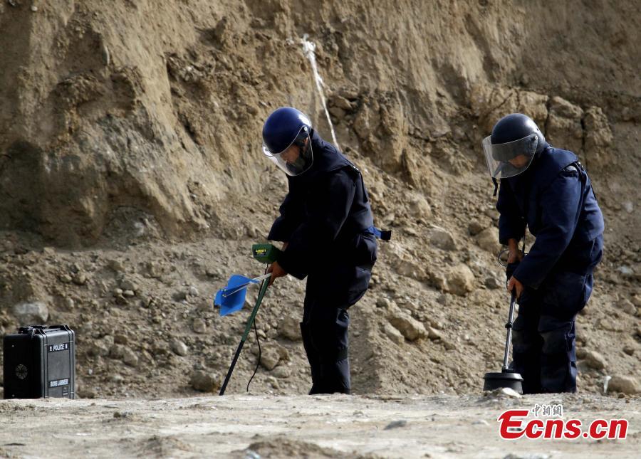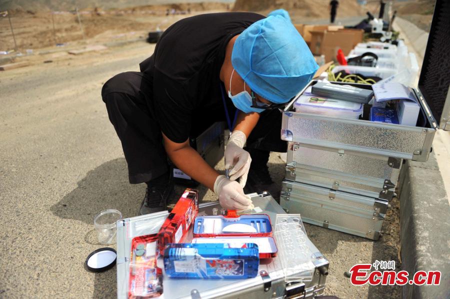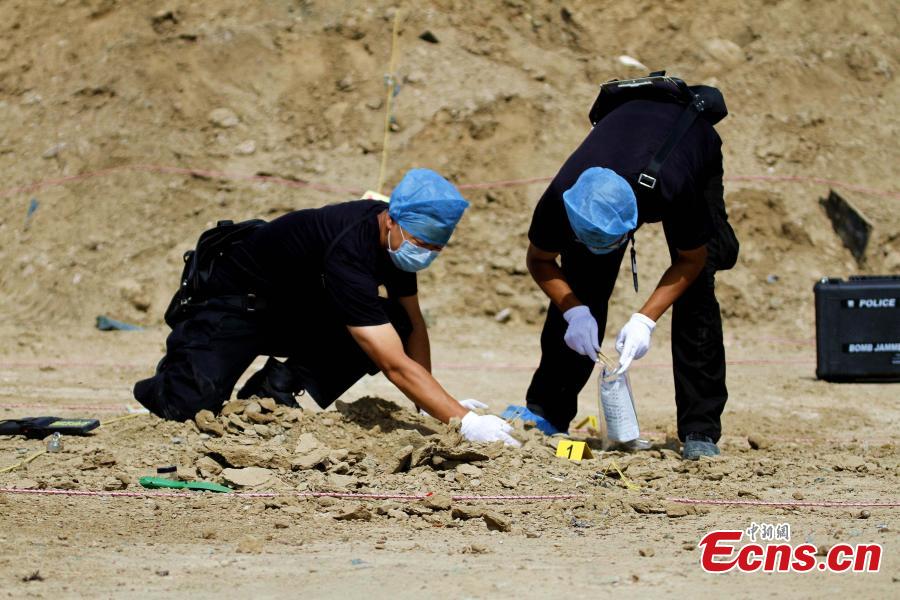 Railway police officers work to dispose of suspected explosives during a drill in Northwest China’s Xinjiang Uygur autonomous region. The police in Xinjiang are using drills to increase their emergency response abilities to ensure the safety of railways and passengers. (Photo: China News Service/Li Guoxian)