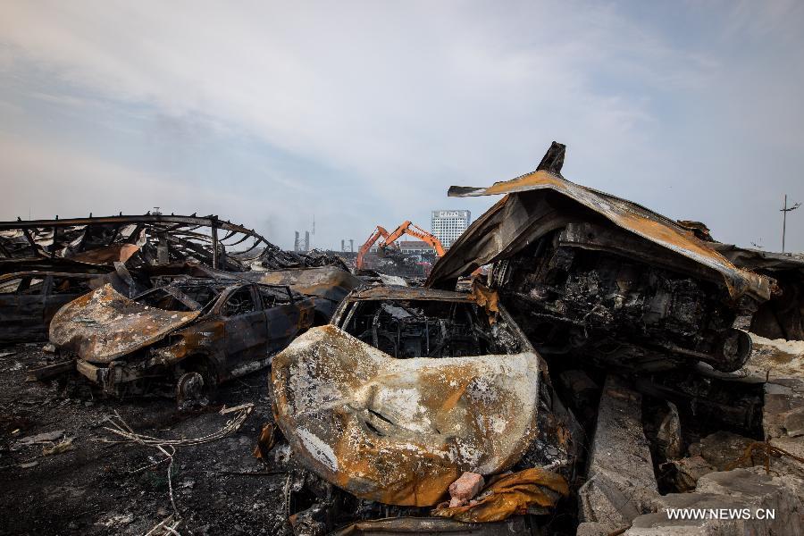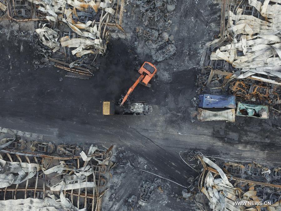 Rescuers clean up debris in the core blast area in Tianjin, Aug. 24, 2015. Rescue authorities updated the death toll from the Tianjin warehouse explosions to 129, with 44 others missing, on Monday. All the dead have been identified, including 76 firefighters, seven policemen and 46 other people. The missing people include 28 firefighters, four policemen and 12 others. Meanwhile, 610 people remain hospitalized, 39 of them in serious condition. (Photo: Xinhua/Zhang Chenlin)