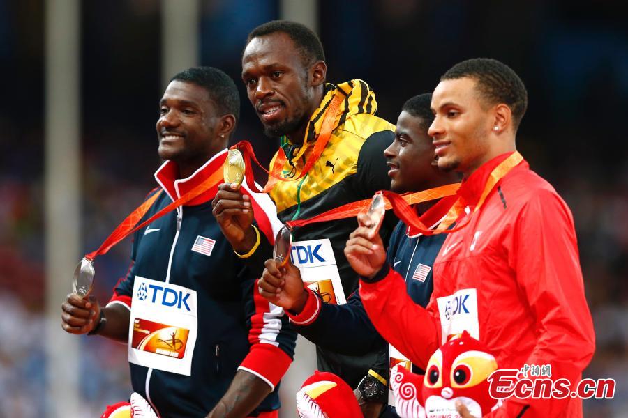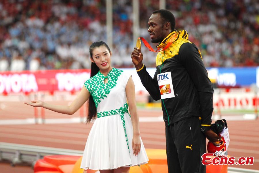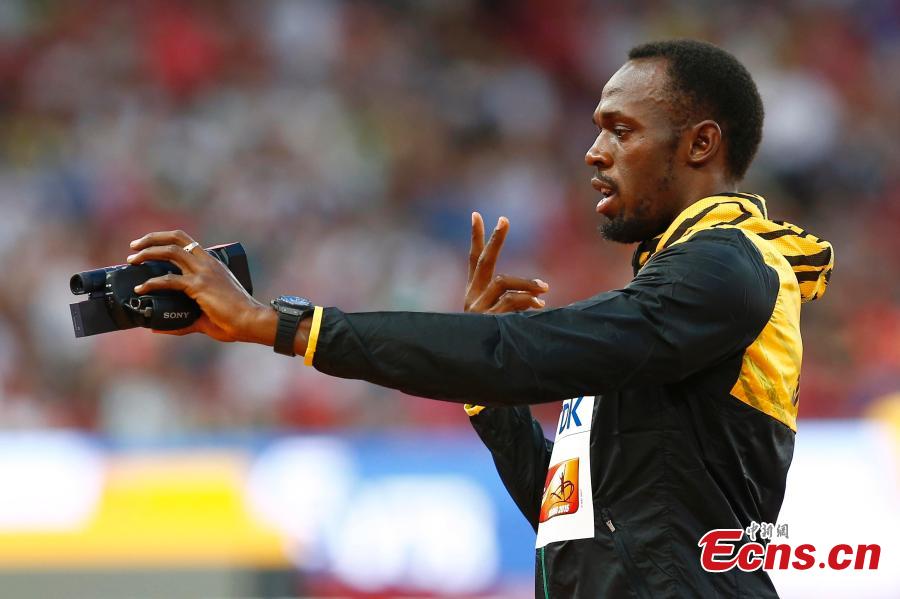 Usain Bolt of Jamaica films during the medal ceremony of the men's 100m during the 15th IAAF World Championships at the National Stadium in Beijing, Aug 24, 2015. Usain Bolt won the 100-meter title in Beijing on Sunday, crossing the line in 9.79 seconds to reassert his status as the fastest man on the planet. (Photo: China News Service/Fu Tian)