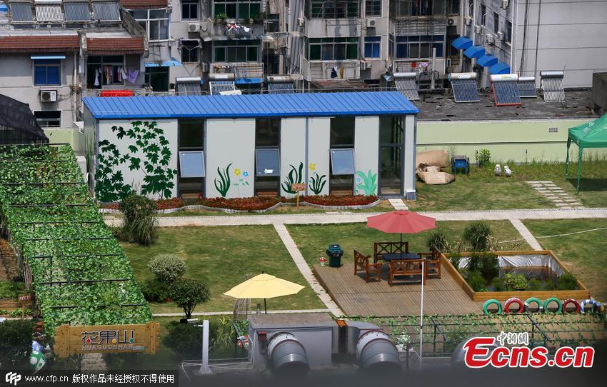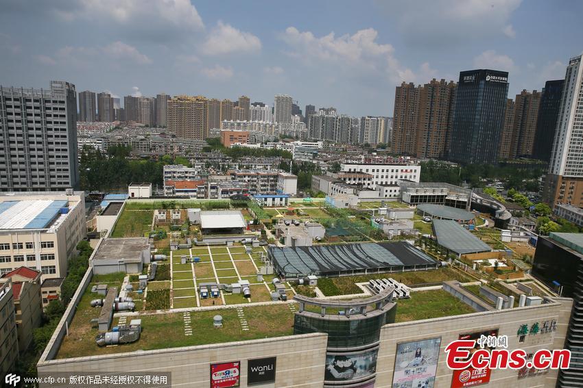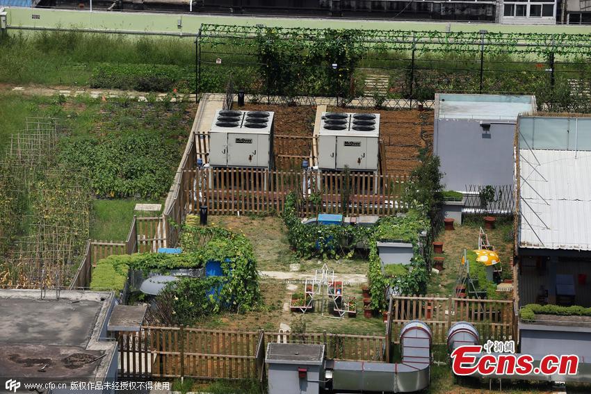 A rooftop garden has been developed atop a shopping mall in Hefei city, capital of East China’s Anhui province, Aug 24, 2015. The garden covers an area of 7,800 square meters and 23 types of vegetables are grown in it. It also includes a zone to raise chickens for adoption as well as peacocks. People can buy ticket to visit the garden or purchase a garden lot. (Photo/CFP)