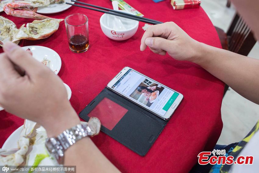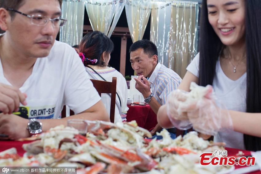 A woman helps a man eat cooked crab at a seafood restaurant in Hangzhou, East China’s Zhejiang province, Aug 28, 2015. The woman, 27, is a retired airline stewardess and known online for her crab-eating skills, such as separating the legs and claws to get meat. She offers the service on Taobao.com, China’s largest e-commerce site, and charges 10 yuan ($1.6) to prepare crab meat and five yuan extra to help with eating. The man spent 260 yuan on the service.(Photo/CFP)