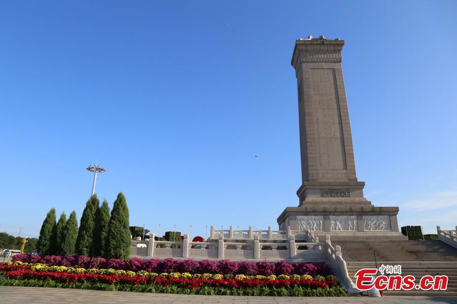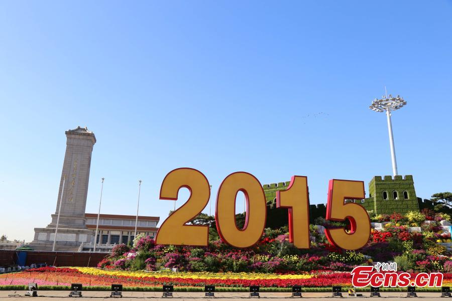 Floral decorations are completed to mark the 70th anniversary of victory in the Chinese People's War of Resistance Against Japanese Aggression (1937-1945) at Tiananmen Square in Beijing, Aug 27, 2015. The decorations will stay in the square until the end of the National Day holiday. (Photo: China News Service/Wang Xu)