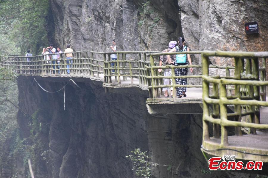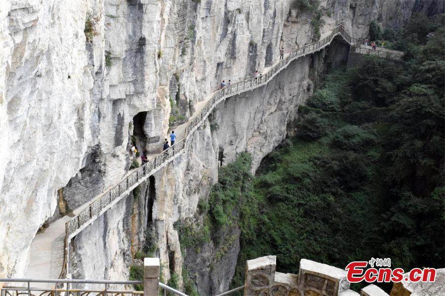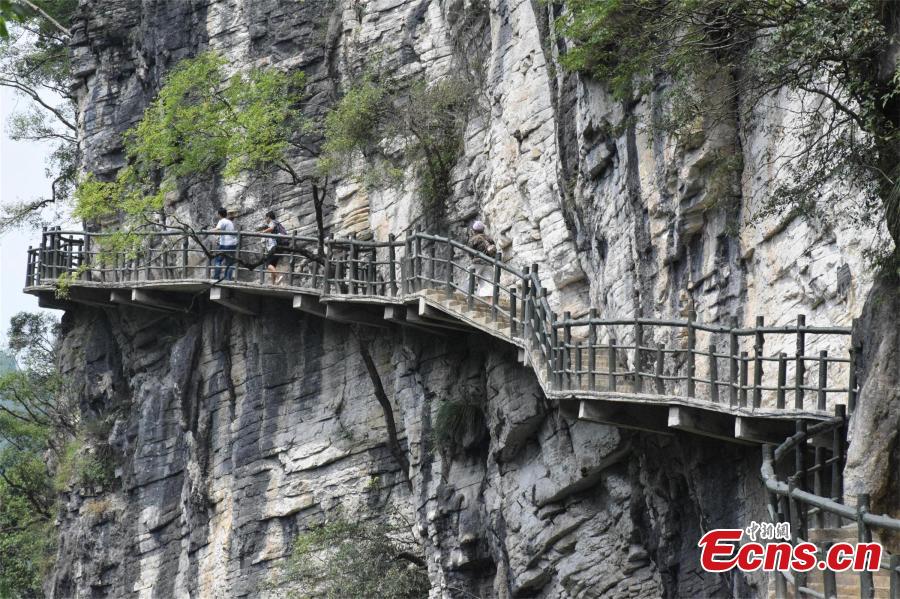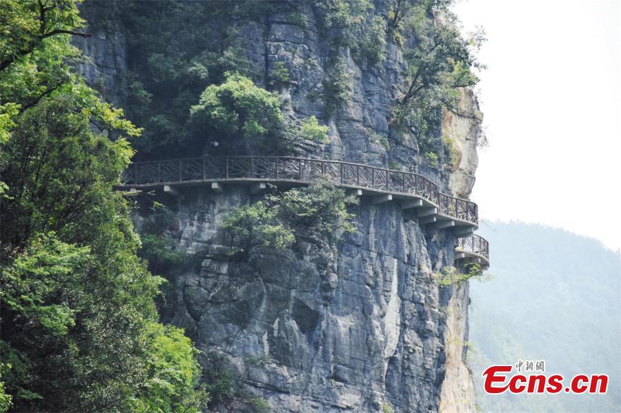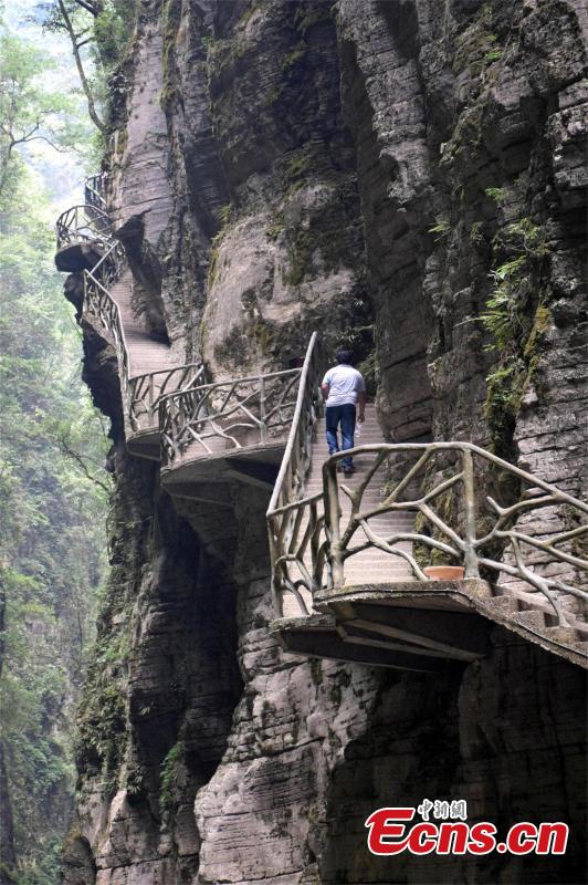 A zigzag walkway built along a cliff is seen at the Shimen River scenic area in Enshi, Central China’s Hubei province, Aug 26, 2015. The walkway extends 5.6 kilometers and is the only route for tourists to the area. (Photo: China News Service/Ma Furong)