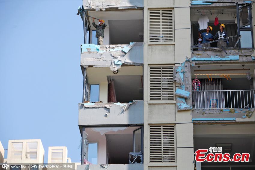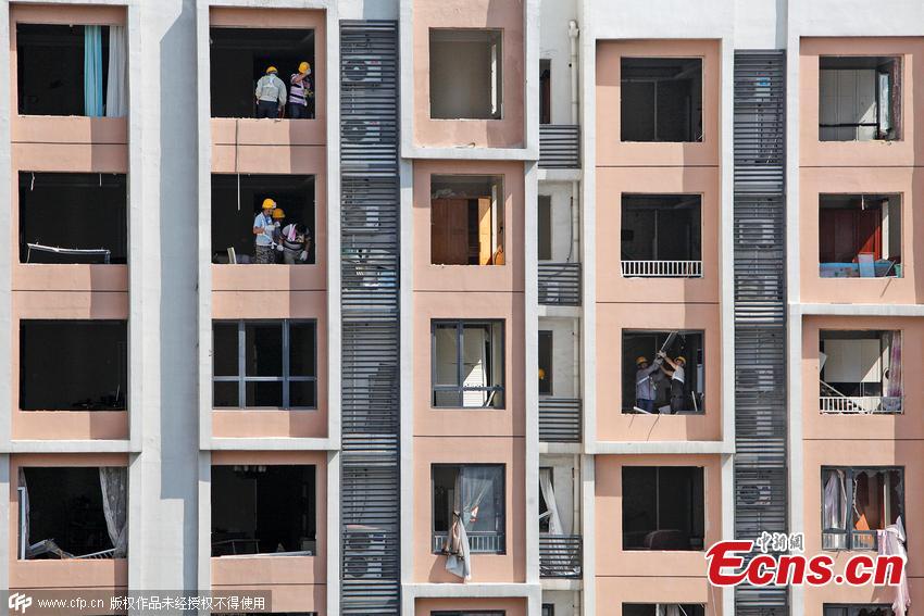 Repairs for houses in four communities that are closest to the core blast area in Tianjin are now underway. Around 2,000 workers have been deployed at the communities of Haigangcheng and Qihanjiayuan to fix damaged doors and windows day and night to restore residential houses as well as to control damage, according to China Construction Sixth Engineering Division Corp Ltd. (Photo/CFP)