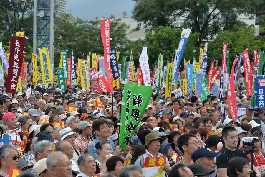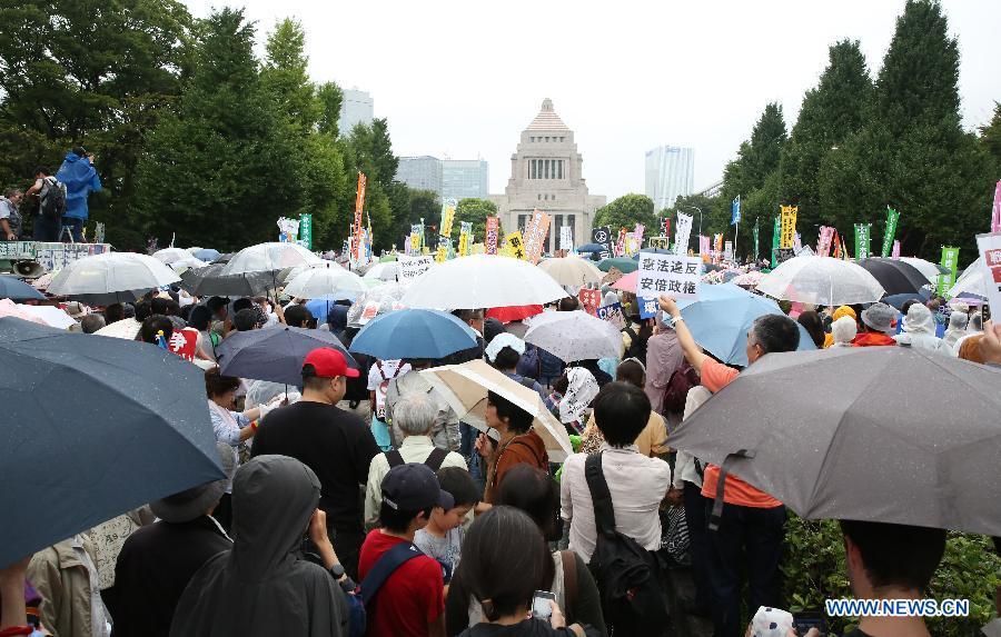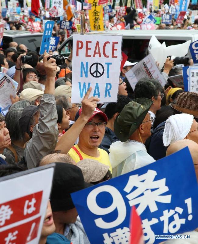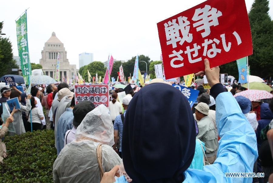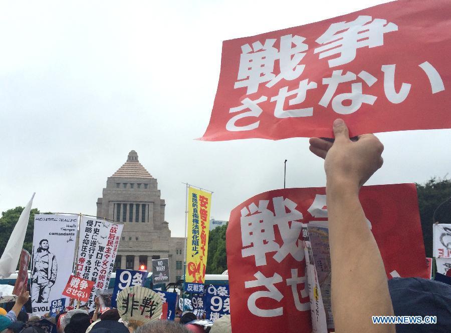 Protesters hold placards during a rally against the controversial security bills in Tokyo, Japan, Aug. 30, 2015. Some 120,000 people rallied and surrounded Japan's parliament building here on Sunday, demanding Prime Minister Shinzo Abe to rescind the controversial security bills. (Photo: Xinhua/Liu Tian)
