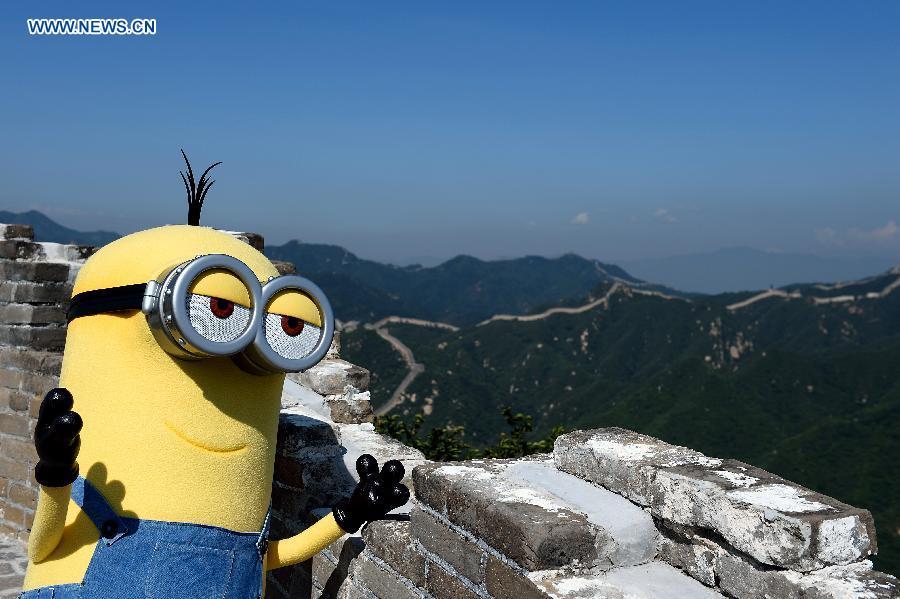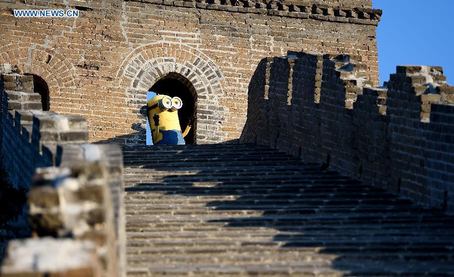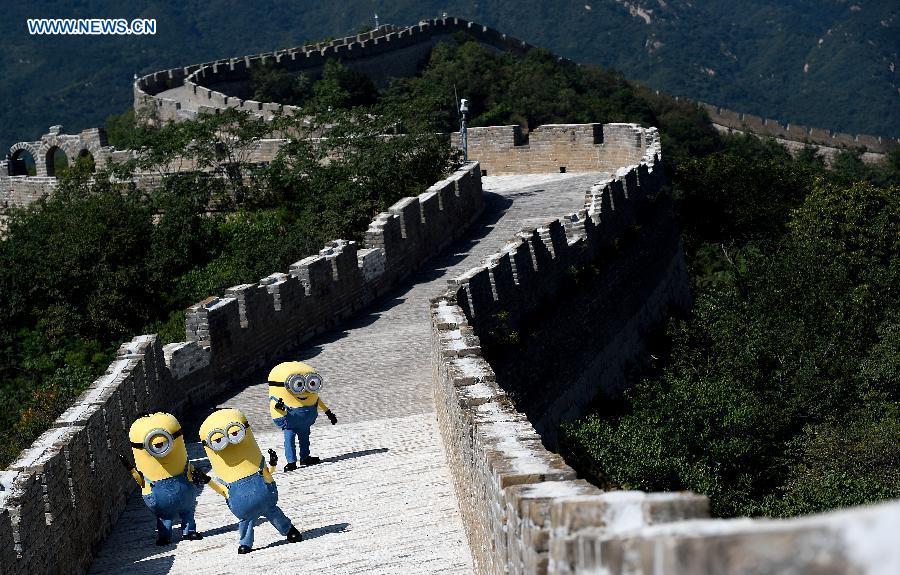 Minions pick up bananas on the Great Wall in Beijing, capital of China, Aug. 29, 2015. The three leading characters in the 3D animation movie "Minions" Stuart, Kevin and Bob got on the Great Wall to say hi to the Chinese audience on Saturday, which also opened their promotion travel in China. The movie will be released in China on Sept. 13. (Photo: Xinhua/Jin Liangkuai)