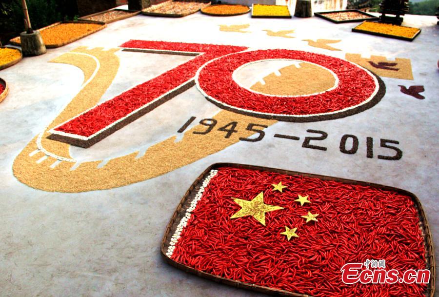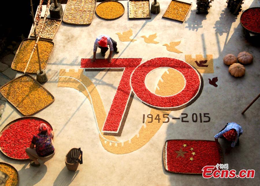 Famers form characters and China’s national flag with peppers in Wuyuan, Jiangxi province on August 31, 2015. Shaiqiu, or Autumn drying, refers to the practice of drying the autumn harvest in the sun. It is commonly seen in Wuyuan, an area noted for its pastoral beauty in Jiangxi province. This year, shaiqiu takes on a new form to celebrate the 70th anniversary of the victory of the Chinese People's War of Resistance Against Japanese Aggression and the World Anti-Fascist War. (Photo: China News Service/ Zhong Xin)