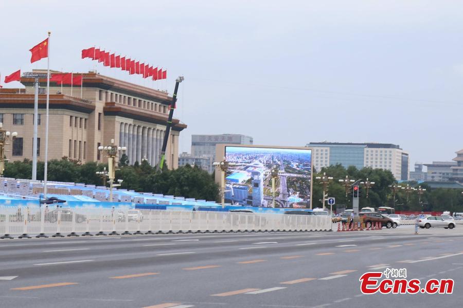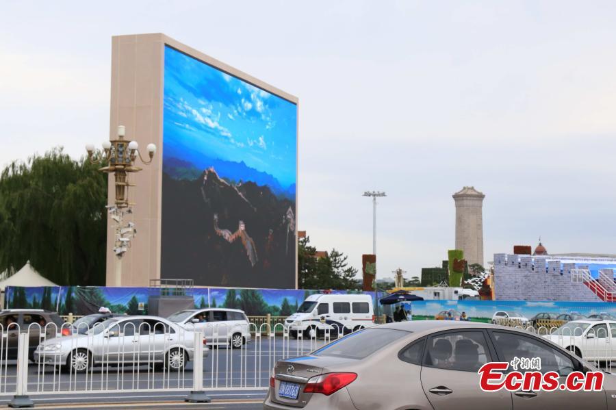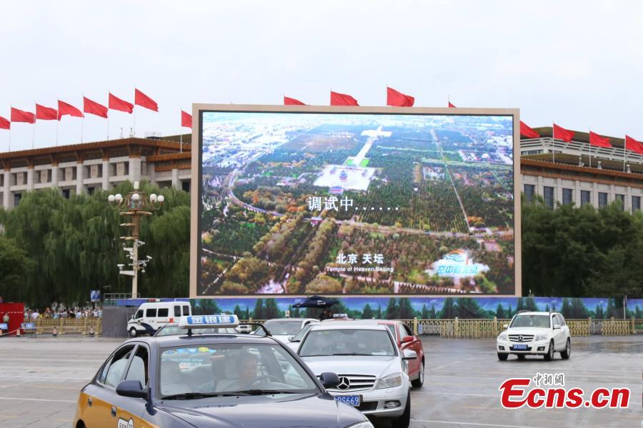 A giant LED screen is switched on with vivid pictures at the Tiananmen Square in Beijing on September 1, 2015. Two such screens have been set up on the square and they are currently being adjusted. Each screen is 18 meters high and 26 meters wide, and the total screen area covers 360 square meters. The electronic screens will be used to broadcast the military parade on September 3. (Photo: China News Service/Wang Xu)