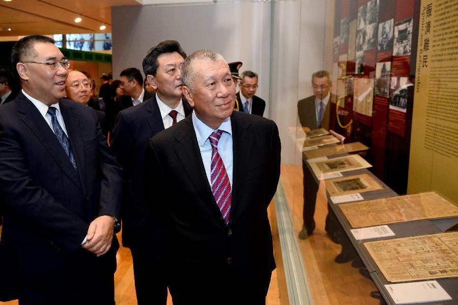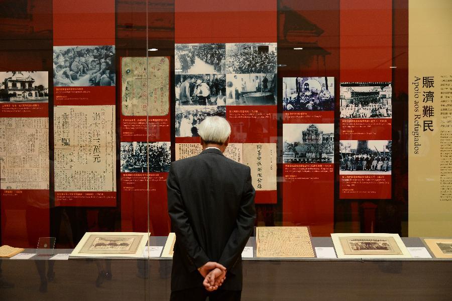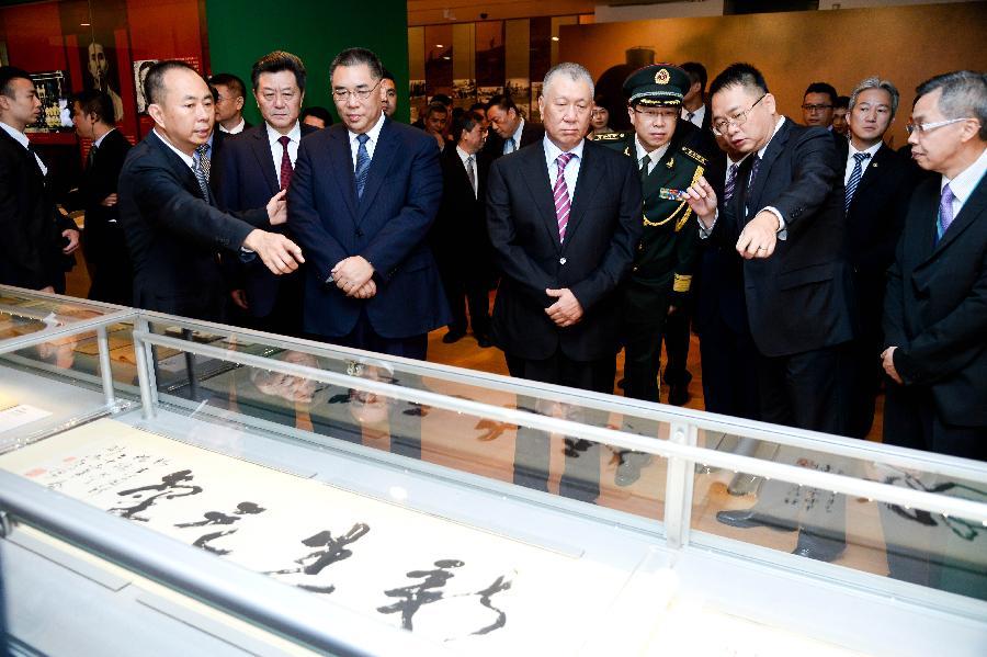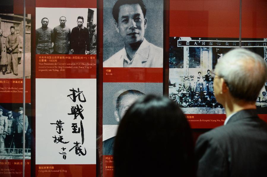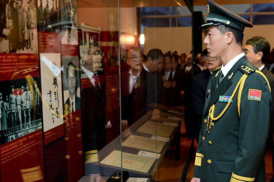 An officer of the Chinese People's Liberation Army (PLA) Macao Garrison visits an exhibition to commemorate the 70th anniversary of the victory of the Chinese People's War of Resistance Against Japanese Aggression and the World Anti-Fascist War, in Macao, south China, Sept. 1, 2015. More than 200 photos and some 80 literature and cultural relics were displayed at the exhibition. (Photo: Xinhua/Cheong Kam Ka)