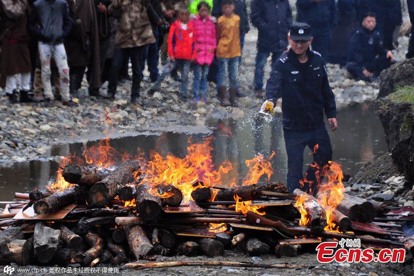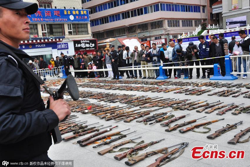 Police officers show illegal weapons at a square in Ganzi Tibetan autonomous prefecture in Southwest China's Sichuan province on September, 1 2015. Illegal firearms including 3,410 guns, 133,207 bullets, 18,002 kilograms of explosives, 182,566 detonators, 29,911 meters of blasting fuse and 2,521 forbidden knives have been confiscated in the region since 2011, according to local police. (Photo/CFP)