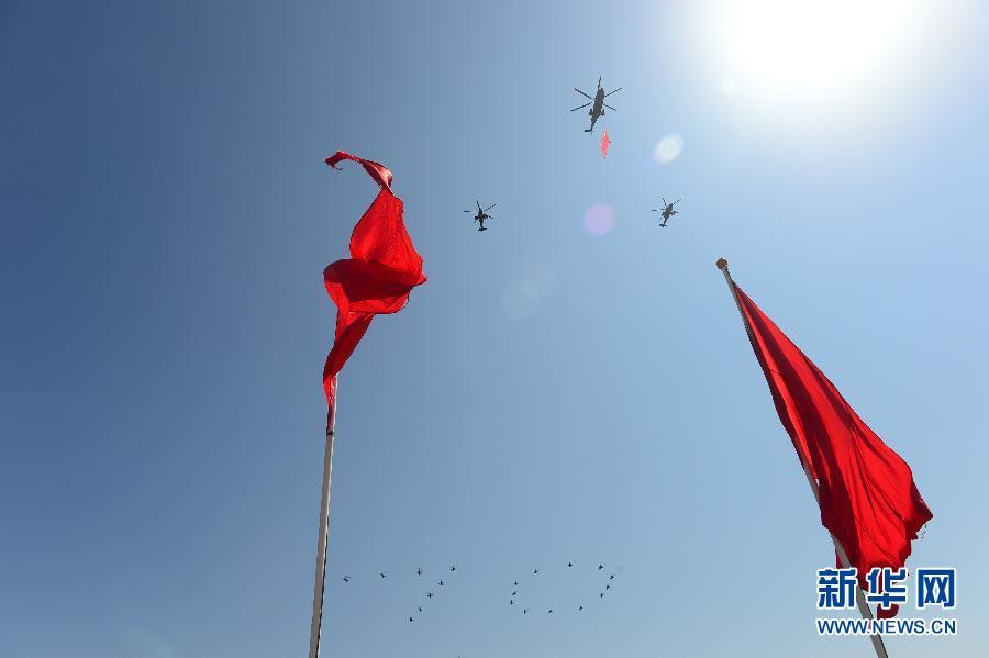 Military helicopters form the number "70" above a Chinese national flag as they perform during the military parade to mark the 70th anniversary of the end of World War Two, in Beijing, Sept 3, 2015. (Photo/Agencies)