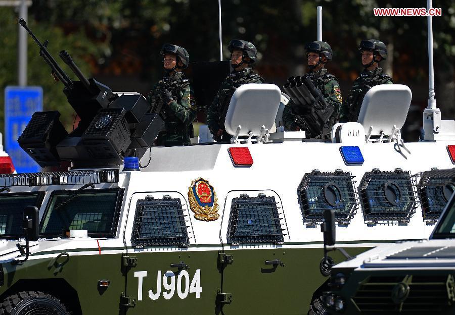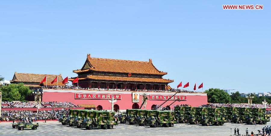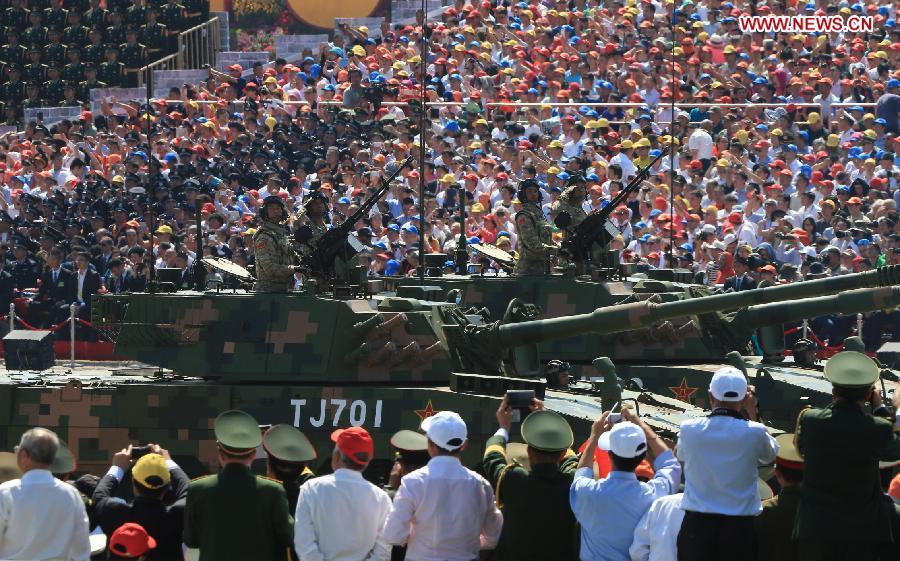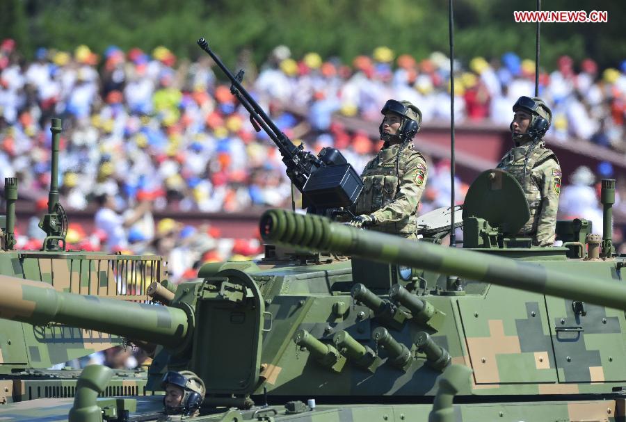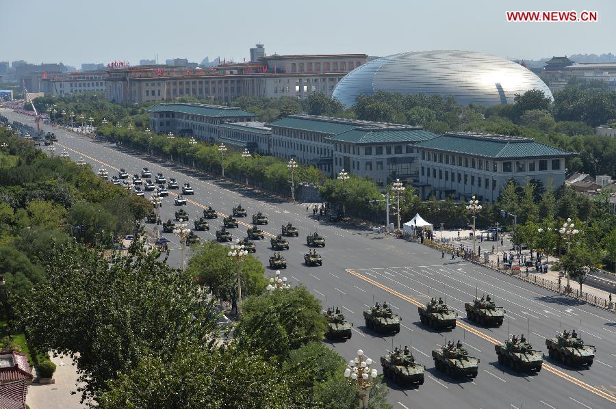 Wheeled armored assault vehicles attend a military parade in Beijing, capital of China, Sept. 3, 2015. China on Thursday held commemoration activities, including a grand military parade, to mark the 70th anniversary of the victory of the Chinese People's War of Resistance Against Japanese Aggression and the World Anti-Fascist War. (Xinhua/Zhou Mi)