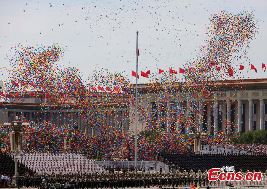 Colorful balloons are released during the commemoration activities to mark the 70th anniversary of the victory of the Chinese People's War of Resistance Against Japanese Aggression and the World Anti-Fascist War, in Beijing, capital of China, Sept. 3, 2015. (CNS photo/Liu Zhen)