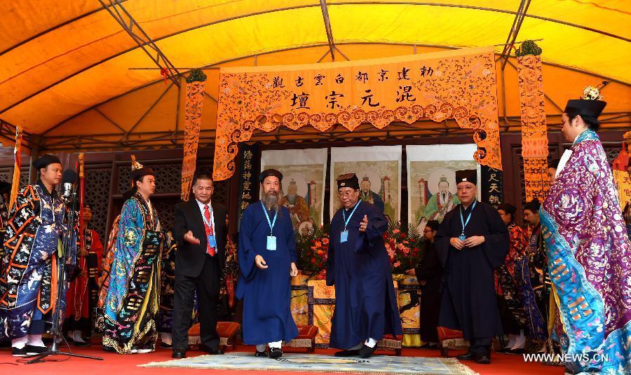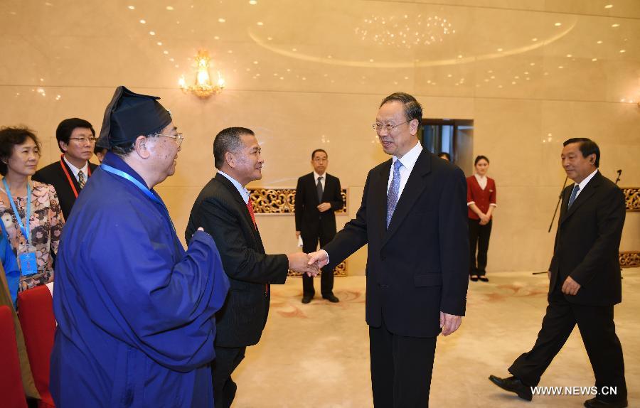 Du Qinglin, vice chairman of the National Committee of the Chinese People's Political Consultative Conference (CPPCC), and Qi Xuchun, vice chairman of the National Committee of the CPPCC, meet with representatives from religious circles attending the praying, in Beijing, capital of China, Sept. 4, 2015. Religious circles in China on Friday held praying and various activities to commemorate the 70th anniversary of the victory of the Chinese People's War of Resistance Against Japanese Aggression and the World Anti-Fascist War. (Xinhua/Zhang Ling)