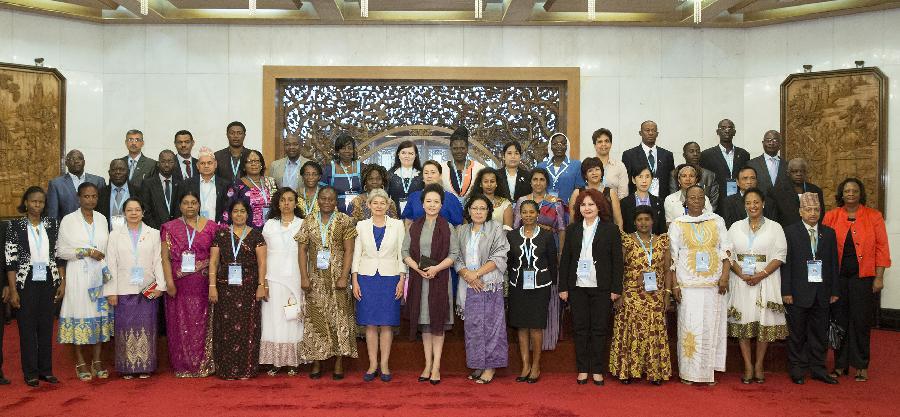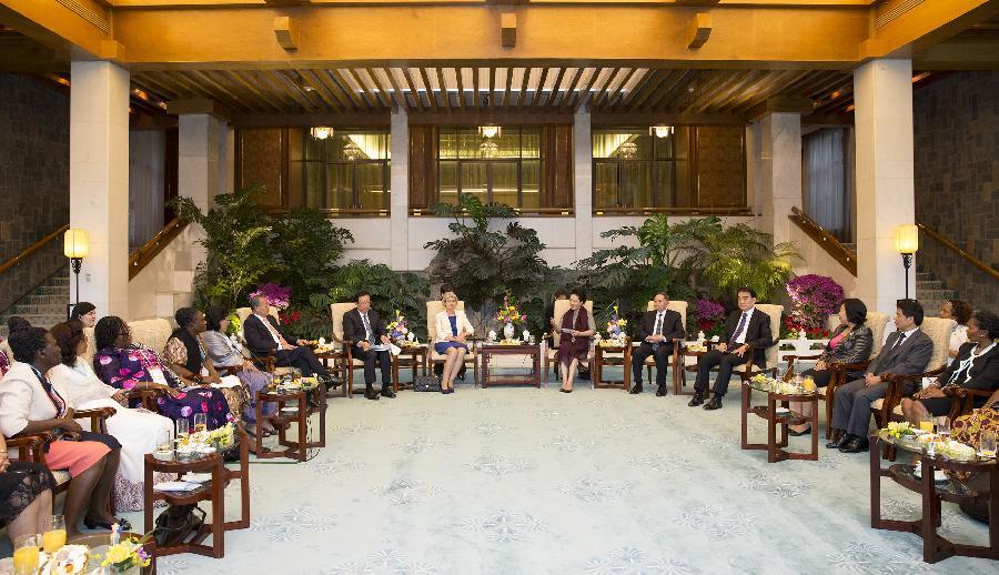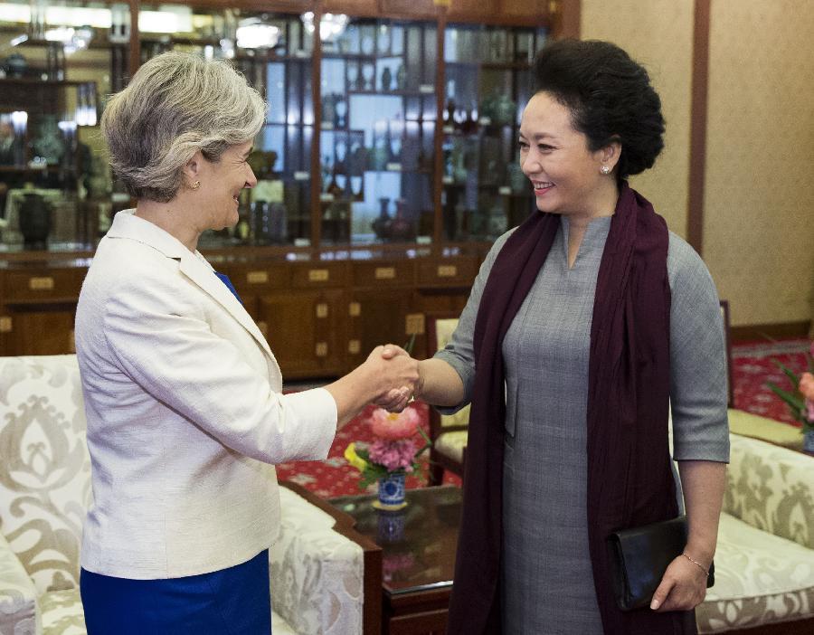 Peng Liyuan (R), wife of Chinese President Xi Jinping, meets with Irina Bokova, director-general of the United Nations Educational, Scientific and Cultural Organization (UNESCO), in Beijing, capital of China, Sept. 4, 2015. (Xinhua/Huang Jingwen)