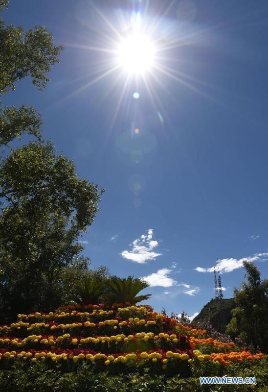 Colorful flags fly over a road in Lhasa, capital of southwest China's Tibet Autonomous Region, Sept. 4, 2015. China will hold celebrations for the 50th anniversary of the founding of Tibet Autonomous Region. (Photo: Xinhua/Chogo)