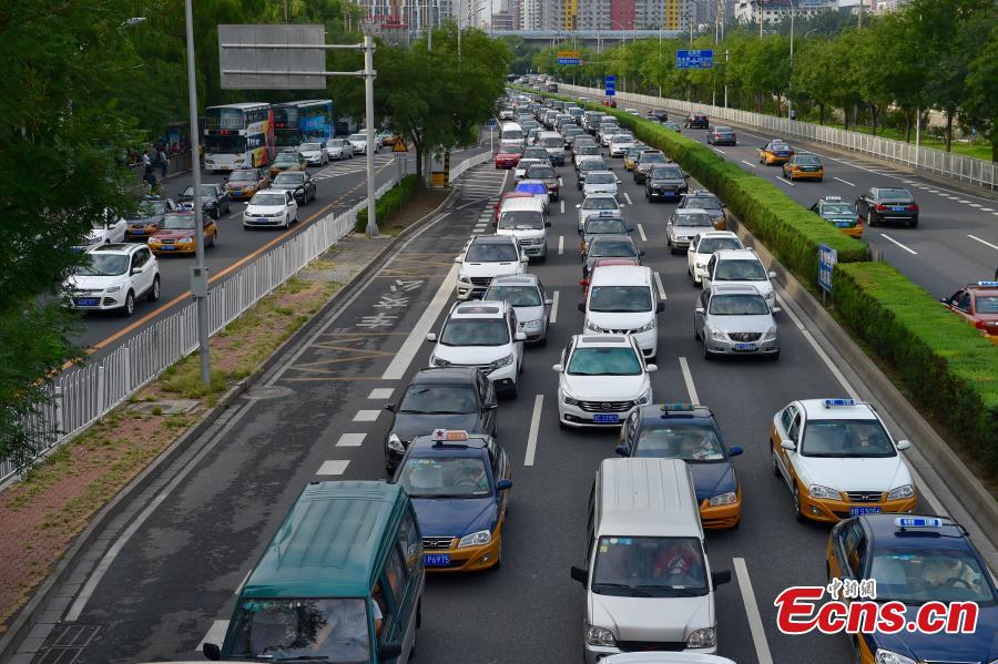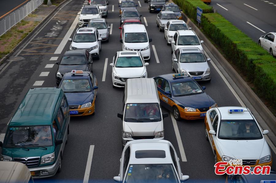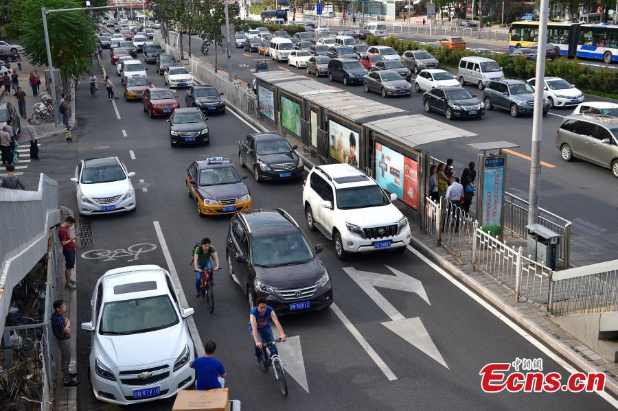 Drivers suffer from a bumper-to-bumper jam on a road in Beijing during the morning rush hours on September 6, 2015. Beijing sees severe traffic congestion on Sunday, the first working day after the parade holiday and without vehicle restrictions. The Beijing transport authority predicted that the traffic performance index in the morning and evening rush hours on Sept 6 will exceed 9.2, which means a running speed below 20 kilometers per hour on most roads in the city, especially around school areas. (Photo: China News Service/ Jin Shuo)