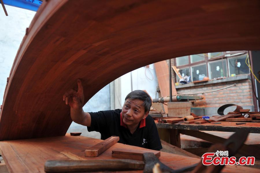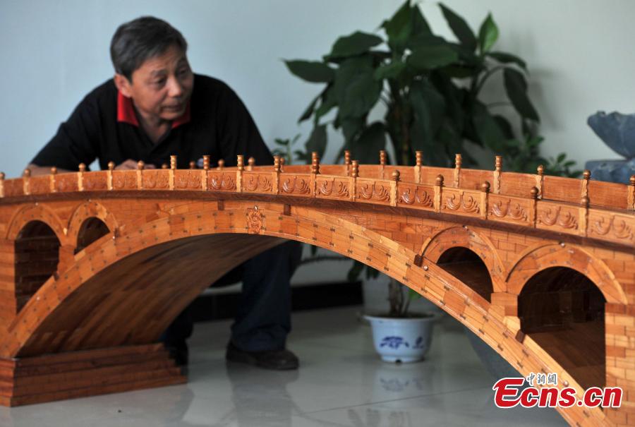 Zhang Jinxian, maker of a mini-sized Zhaozhou Bridge shows his artwork in his home in Hebei province on September 5, 2015. Zhang, a farmer of Zhaoxian county used over 7,000 wood pieces to make the two-meter-long replica of the legendary stone structure. The Zhaozhou Bridge, locally nicknamed Dashiqiao, "big stone bridge", is built between AD 605 and 618, and is now one of the oldest and most renowned stone arch bridges in the world. (Photo: China News Service/ Zhai Yujia)
