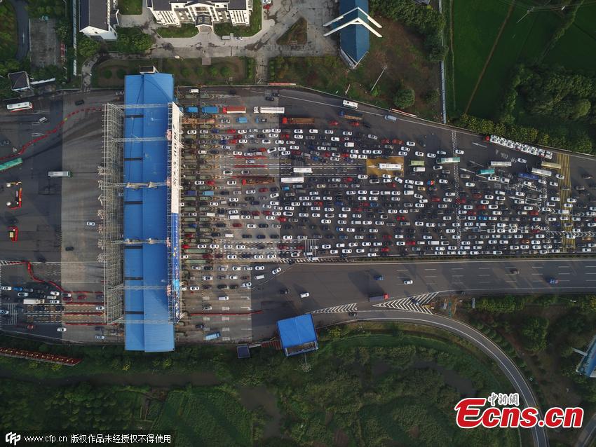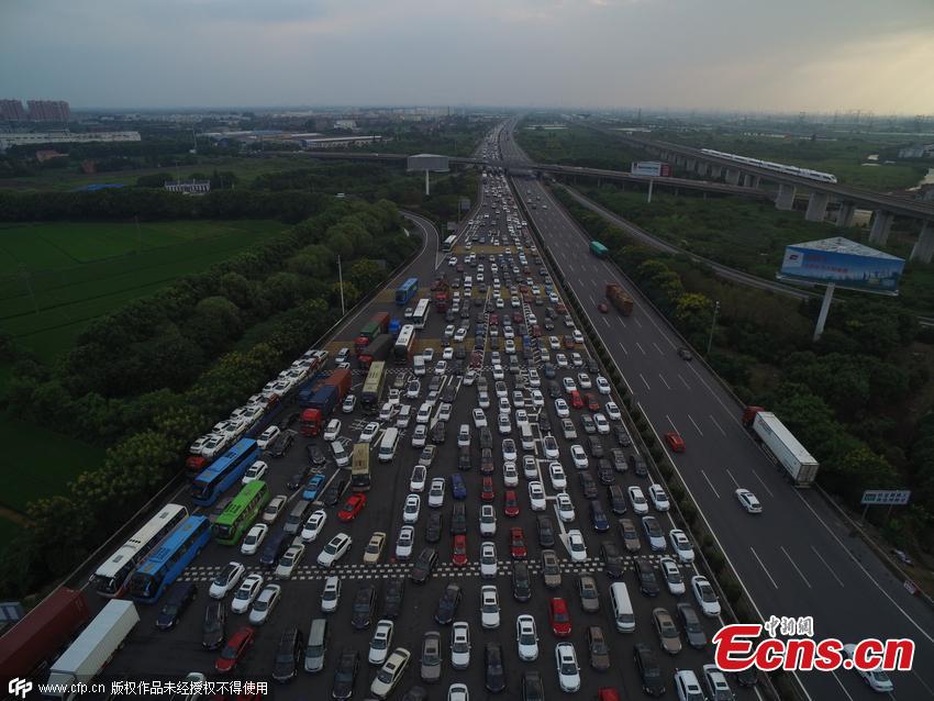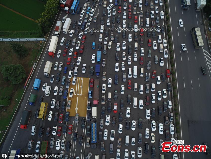 A section of the Hukun (Shanghai to Kunming) Expressway in Jiaxing in East China’s Zhejiang province is clogged with three kilometers of cars on Saturday afternoon, September 5, 2015. Travel rush is seen across China after the three-day parade holiday. (Photo/CFP)