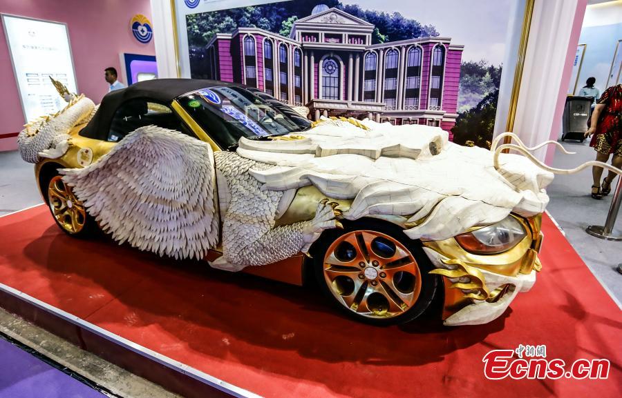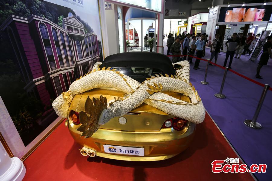 A BMW Z4 decorated with yaks' leg bone-carved ornaments and pure gold is on display at an exhibition in Guangzhou, South China’s Guangdong province on September 5, 2015. The luxury facelift took 19 carving masters three years and six months. (Photo: China News Service/ Liu Jiao)