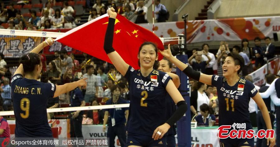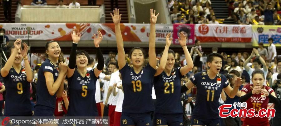 Chinese players celebrate after beating Japan to win the women's volleyball World Cup in Nagoay, Japan on Sept. 6 (Photo/China News Service)