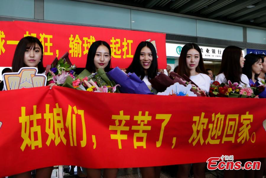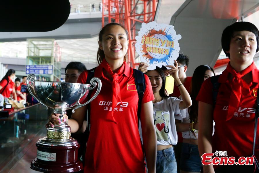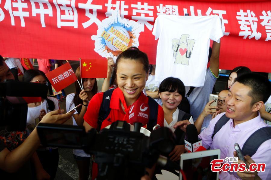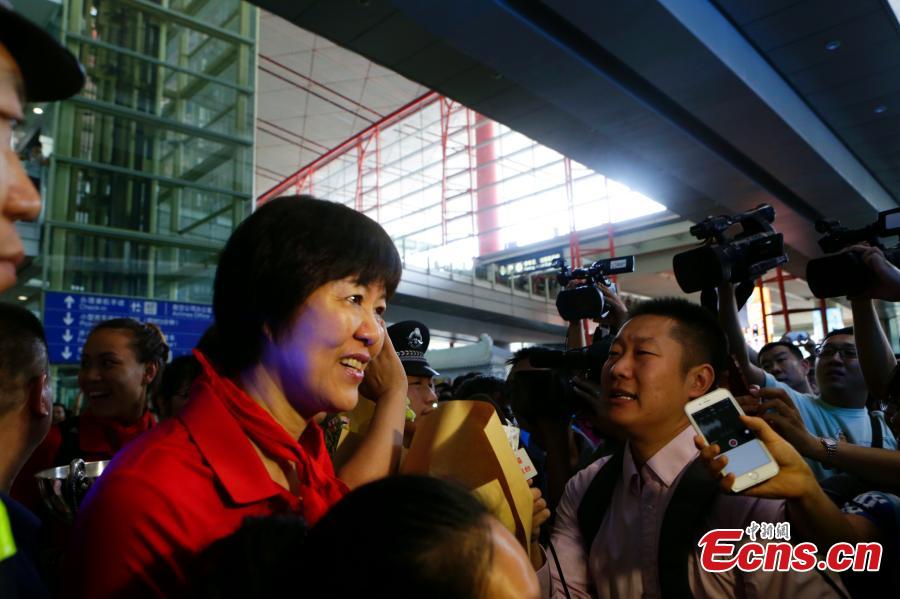 Chinese players, led by China's head coach Lang Ping (C), are greeted by fans as they return from the 2015 Women's Volleyball World Cup in Nagoya, Japan, at Beijing Capital International Airport, September 7, 2015. The once all-conquering Chinese women's volleyball team regained its mojo by outperforming host Japan to win the FIVB World Cup on Sunday and qualify for the Rio de Janeiro Olympics next year. (Photo: China News Service/ Li Huisi)