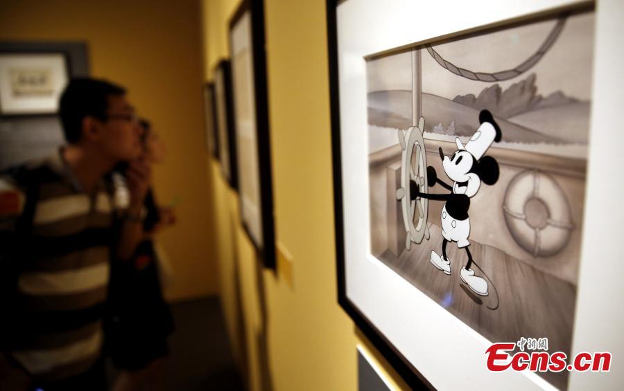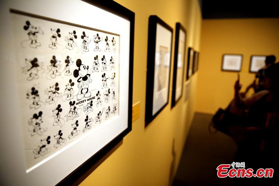 Visitors take photos for sketches and storyboards of Disney's classic fairy tales during at exhibition in Shanghai on September 7, 2015. The exhibition with four themes of “friendship,” “family,” “courage,” and “love” features items including original paintings, story sketches, and animation drawings. (Photo: China News Service/ Tang Yanjun)