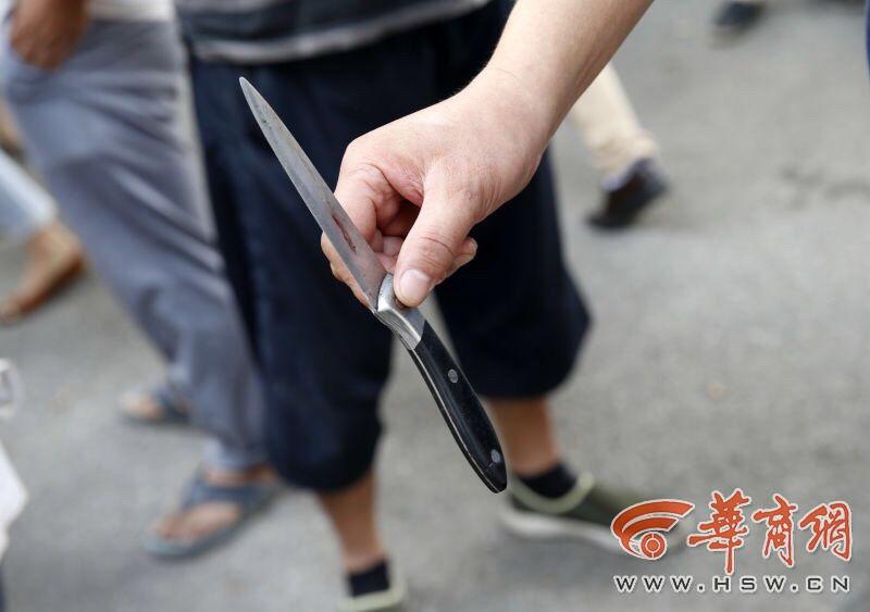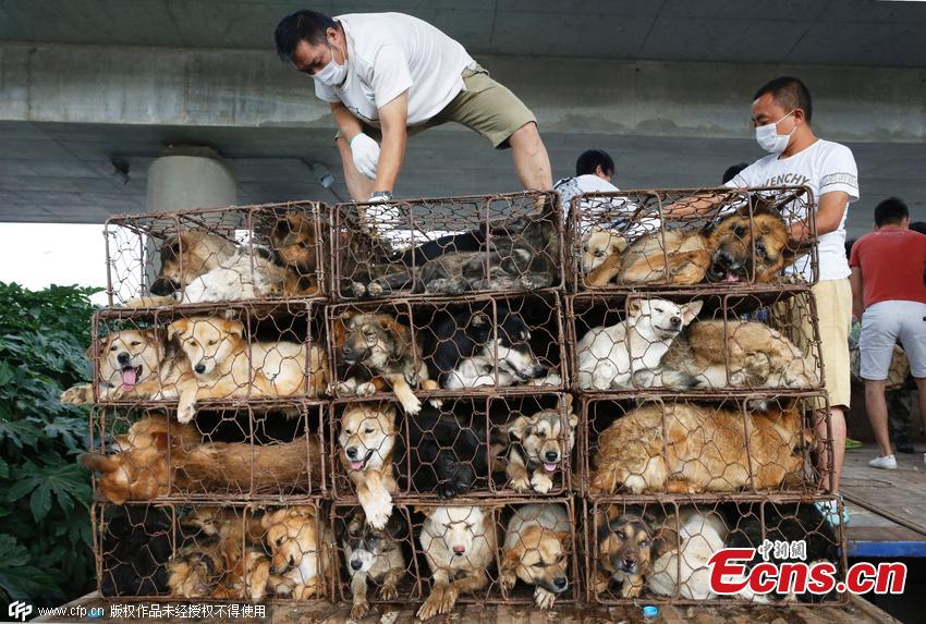 A reporter snatches a knife from a woman who hurts herself to avoid animal activists from taking away dogs on her truck on an expressway in Xi'an, Northwest China's Shaanxi province, September 6, 2015. The woman, wife of a driver of the truck loaded with 200 dogs, stuck the knife into her leg after their car was pulled over by animal lovers. After nine hours of stalemate, volunteers rescued caged dogs from the truck. The woman was sent to nearby hospital. (Photo/CFP)
