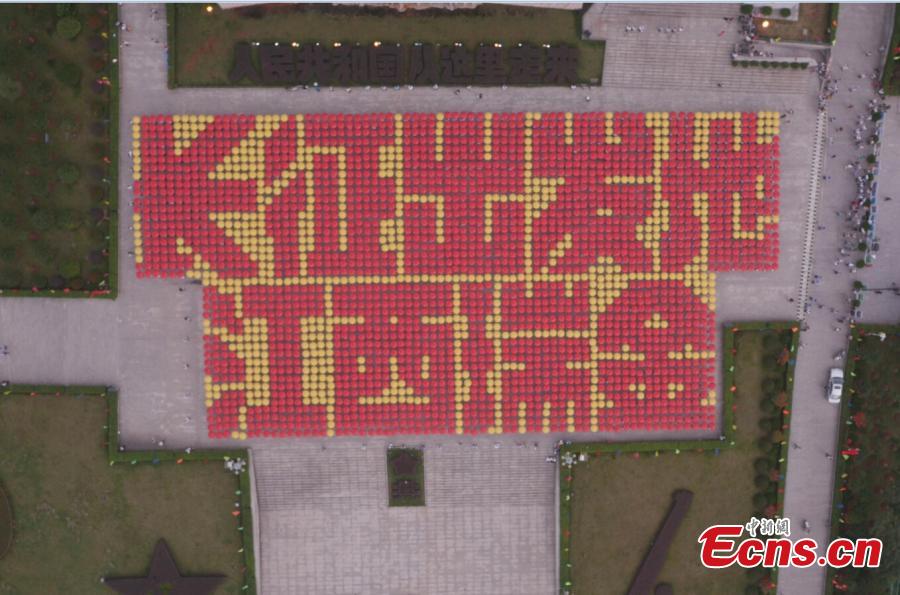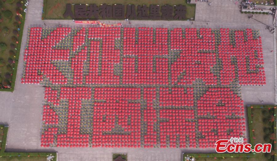 2,880 middle school students simultaneously raise red and yellow umbrellas to create the characters "Ruijin-starting point of the Long March" during an event in Ruijin, Southeast China’s Jiangxi province on September 7, 2015. The county-level city is one of the earliest centers of revolutionary activity for the Communist Party of China.(Photo: China News Service/ Cai Tao)