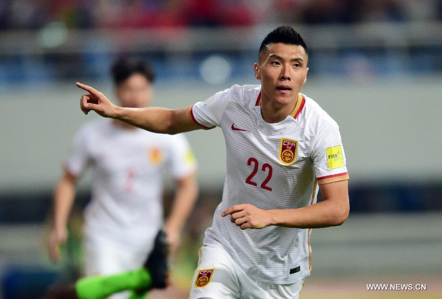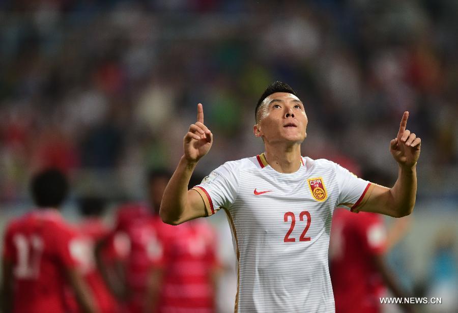 China's Yu Dabao celebrates his second goal during the 2018 FIFA World Cup qualifying match against the Maldives at Shenyang Olympic Center stadium in Shenyang, capital of northeast China's Liaoning Province, Sept. 8, 2015. China won the match 3-0. (Photo: Xinhua/Yang Qing)