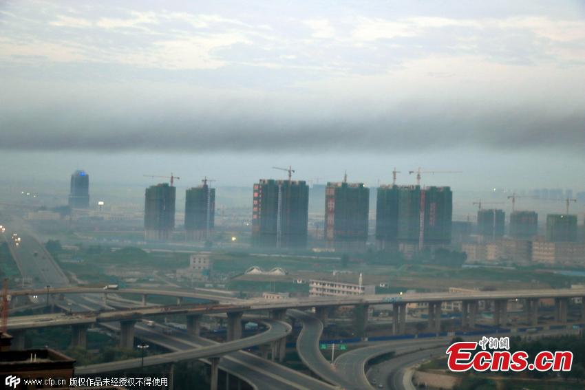 A flake of “black cloud” is seen in sky over Zhengzhou, capital city of Central China’s Henan province on September 8, 2015. The pollution zone like "advection fog" started to hang over the city from 6: 00 a.m. in Tuesday. (Photo/CFP)