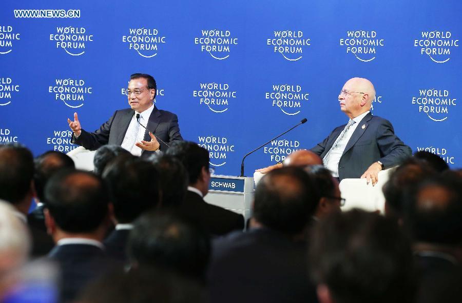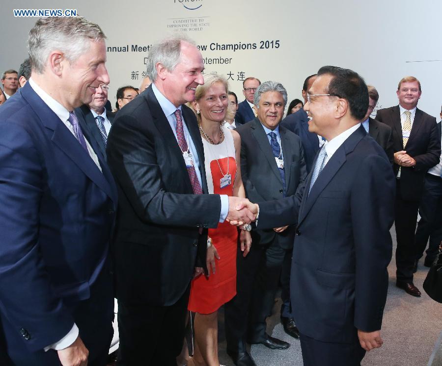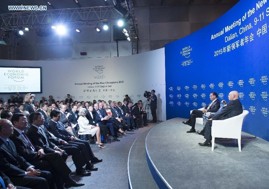 Chinese Premier Li Keqiang (2nd R) exchanges views with Klaus Schwab (R), founder and executive chairman of the World Economic Forum (WEF) and other participants at the World Economic Forum (WEF) in Dalian, northeast China's Liaoning Province, Sept. 9, 2015. The three-day meeting will last from Sept. 9 to 11. (Photo: Xinhua/Wang Ye)