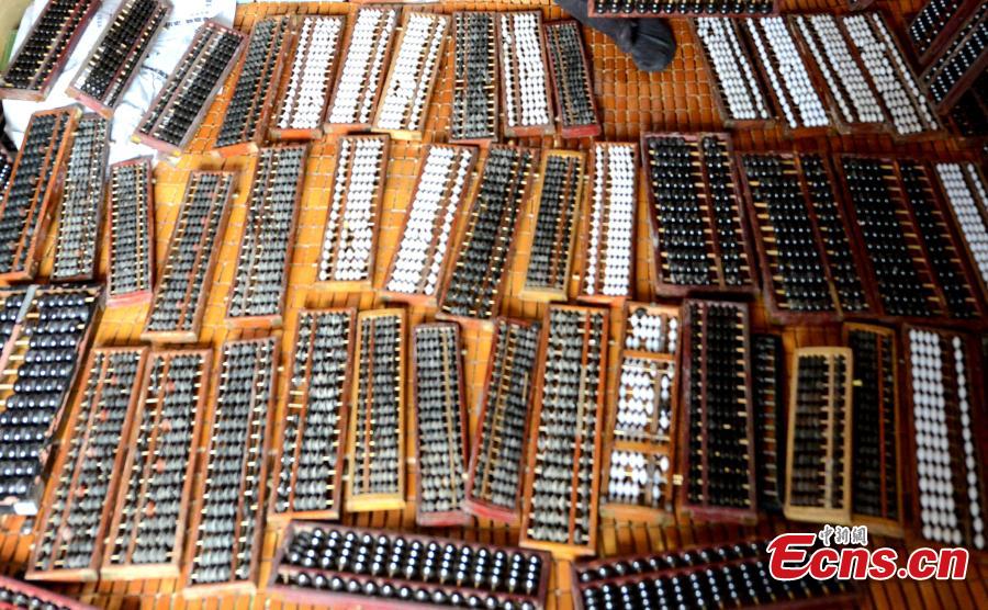 Zhang Zuren shows abacuses at his home in Fuzhou, East China’s Fujian province on September 9, 2015. He is a collector of over 300 such ancient-style calculator. (Photo: China News Service/ Liu Kegeng)