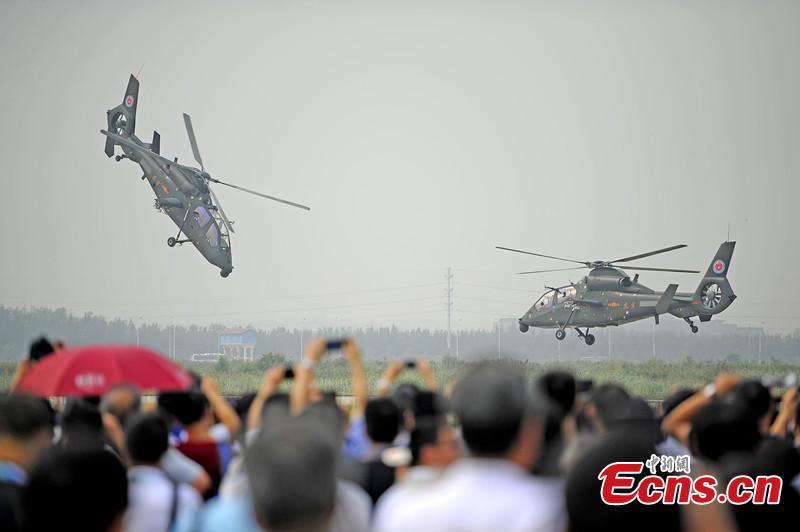 Gunships perform at the opening ceremony of the Tianjin International Helicopter Exhibition in a helicopter base of Aviation Industry Corporation of China in the Airport Area of China Pilot Free Trade Zone of Tianjin, Sept. 9, 2015. The exhibition displayed 56 helicopters and attracted 366 enterprises. (CNS photo/Tongyu)