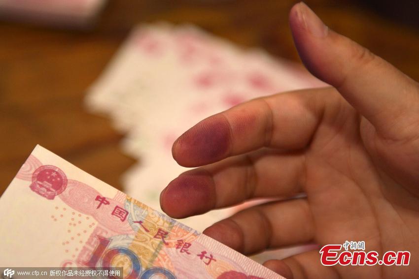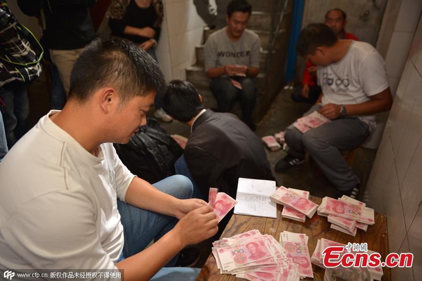 Police officers count fake notes in a village in Kunming, Yunnan province on September 9, 2015. Local police seized counterfeit money worth 300,000 yuan($47,026) in the campaign. Three suspects were detained. (Photo/CFP)