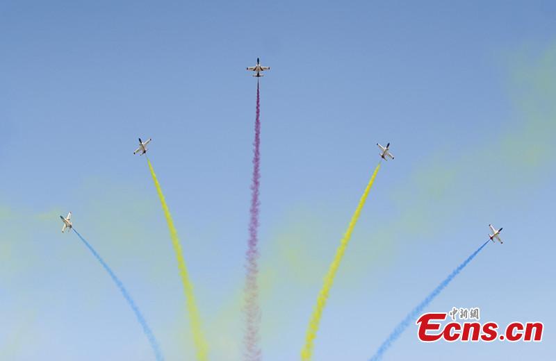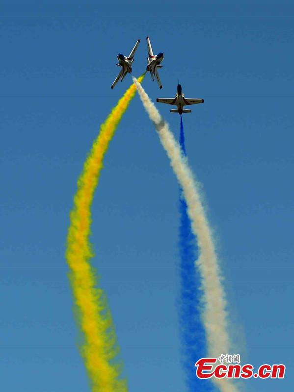 The "Tianzhiyi" aerobatic aircrafts from the Aviation University of Air Force perform in Changchun, capital of Jilin Province, Sept. 10, 2015. The Aviation Open Day of the Air Force of the CPLA and the opening ceremony for the Aviation University of Air Force was held here on Thursday. (CNS photo/Zhangyao)