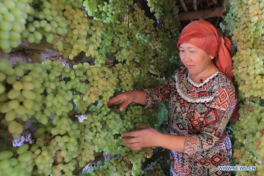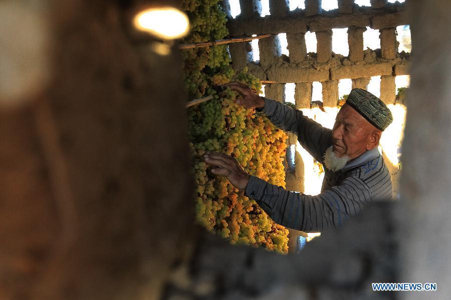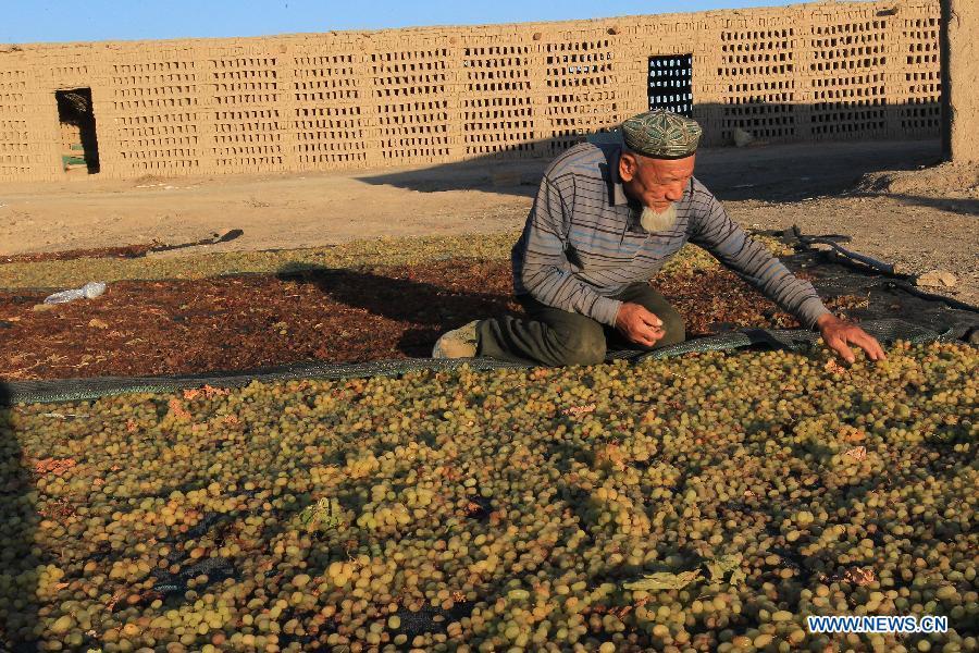 A man air dries grapes in Hami, northwest China's Xinjiang Uygur Autonomous Region, Sept. 12, 2015. Local growers are busy drying grapes for the production of raisin recently as grapes have entered the harvest season. (Photo: Xinhua/Polat)