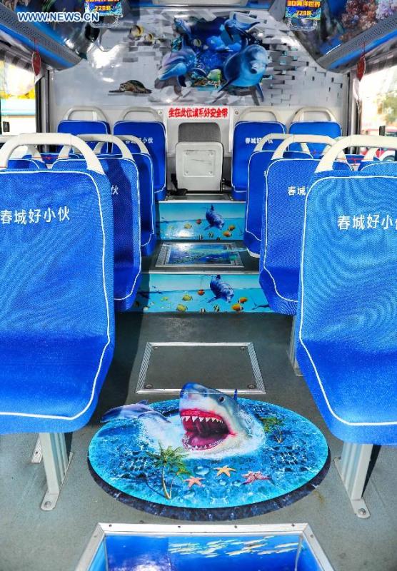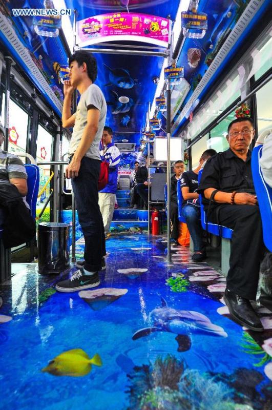 Photo taken on Sept. 14, 2015 shows an ocean theme bus in Changchun, northeast China's Jilin Province. A No. 229 bus decorated with 3D ocean painting went into service in Changchun on Monday. (Photo: Xinhua/Xu Chang)