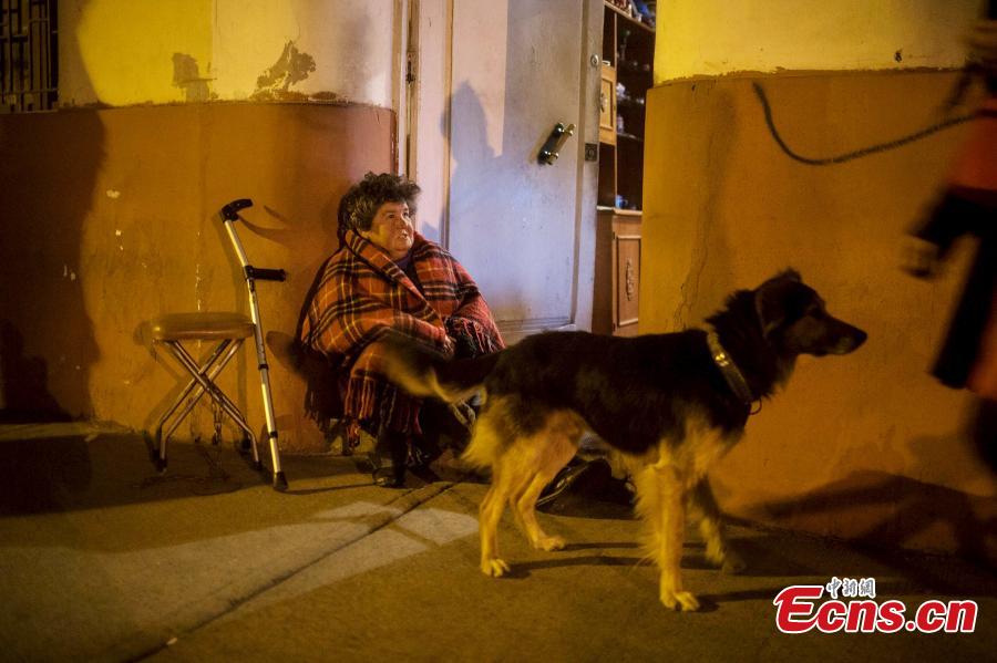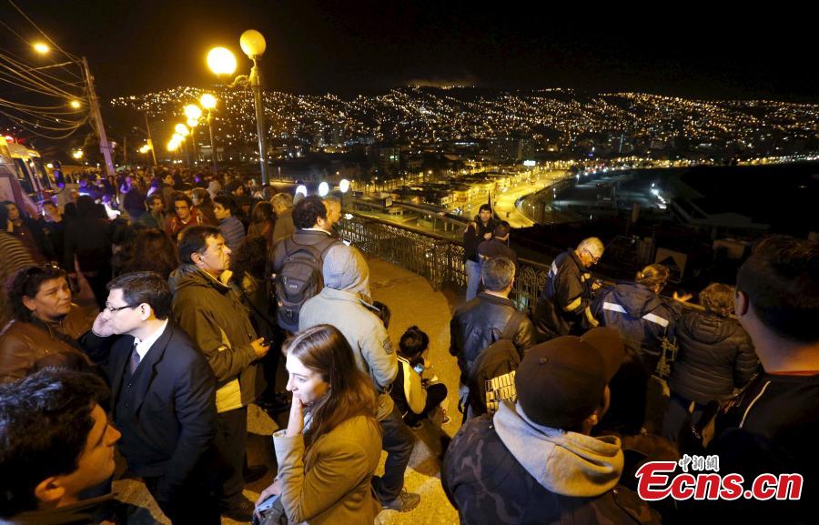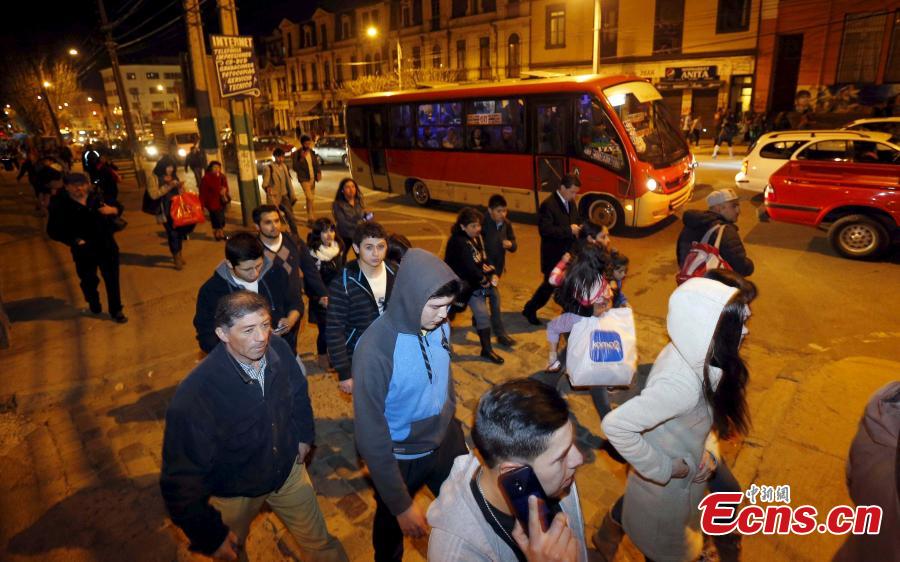 Residents stand on a street outside their houses after an earthquake hit Chile's central zone, in Santiago, Chile, September 16, 2015, locl time. A 8.3-magnitude earthquake hit off the coast of Chile on Wednesday, shaking buildings in the capital city of Santiago and generating a tsunami warning for Chile and Peru. (Photo/Agencies)