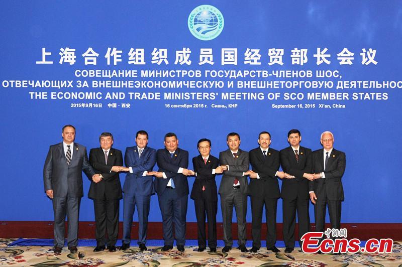 Sept. 16th, Xi'an, The economic and trade minister's meeting of SCO member states was held. Gao Hucheng(center), the Chinese minister of Commerce and other foreign ministers are joining in the photo session. (CNS photo/Zhang Yuan)