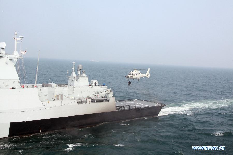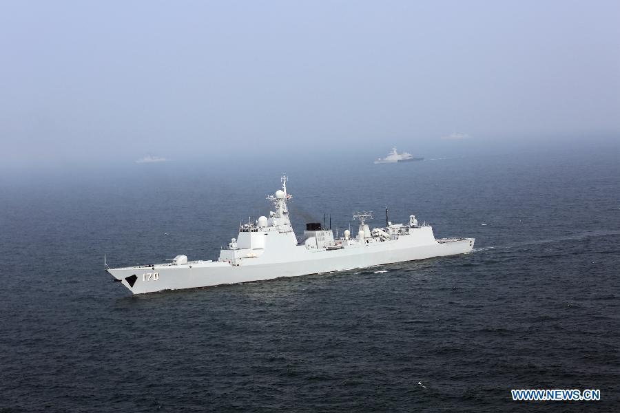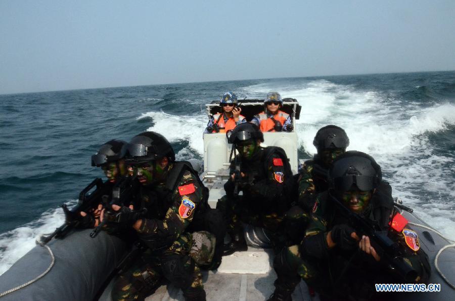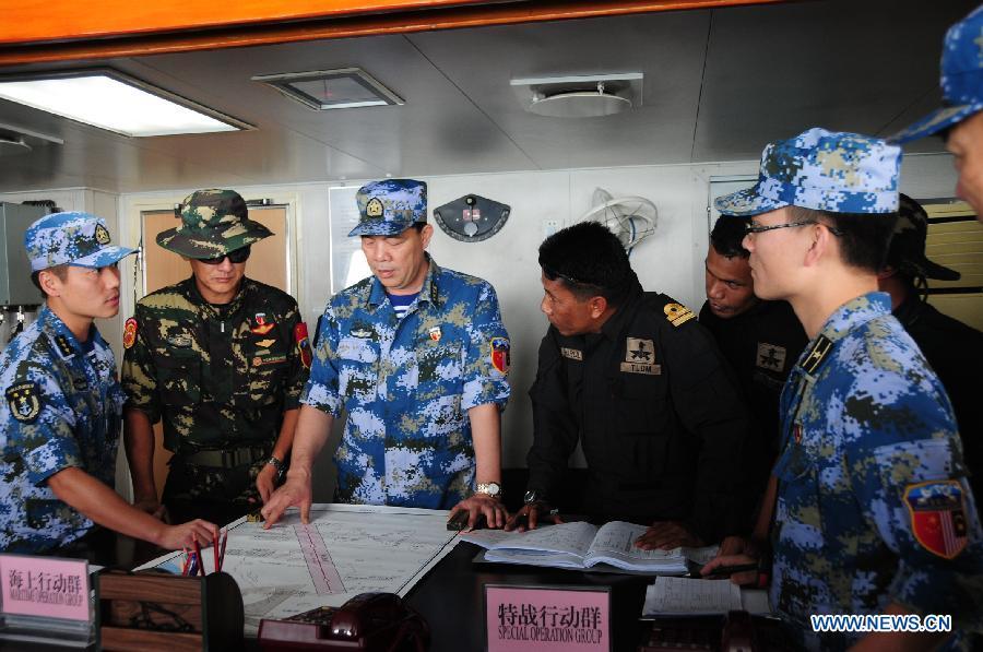 Chinese and Malaysian commanders work together in a joint escort exercise during their first joint military drill, coded "Peace and Friendship 2015", aboard Chinese missile destroyer Lanzhou in the Malacca Strait, Sept. 19, 2015. (Xinhua/Wang Yushan)