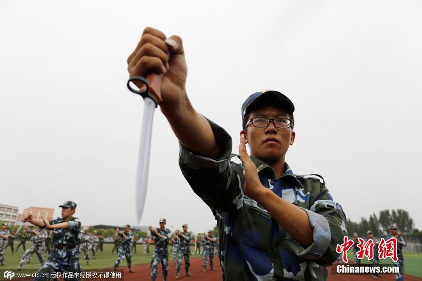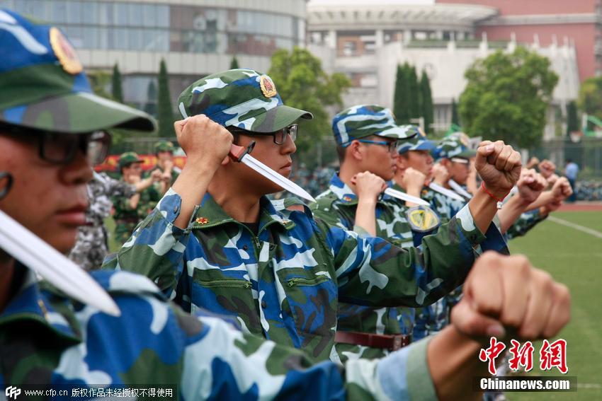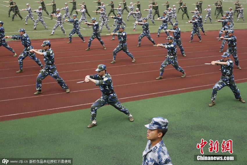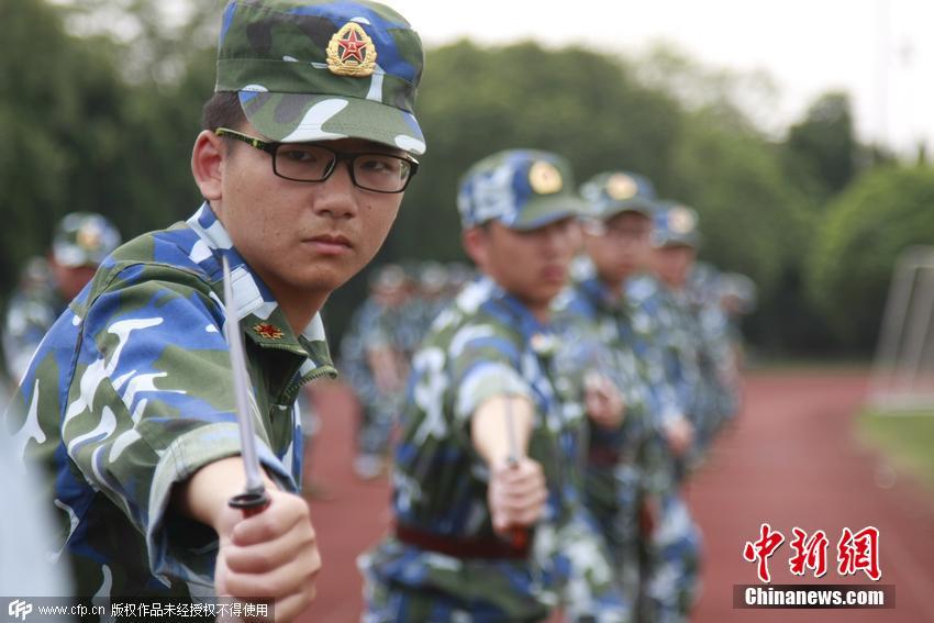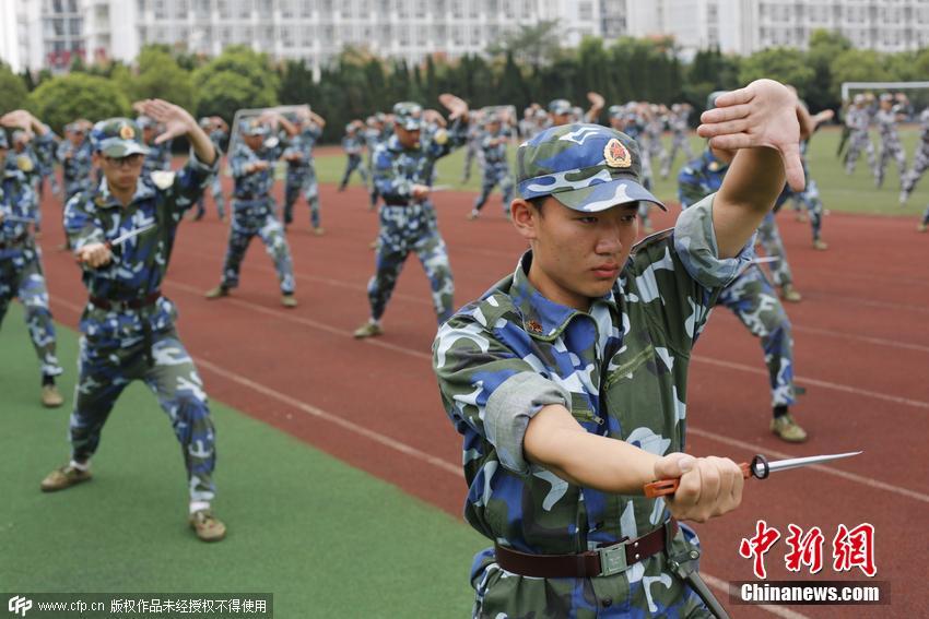 Freshmen perform a "blade exercise" during military training in China Jiliang University in Hangzhou city, Zhejiang province, Sept 18. (Photo/CFP)
