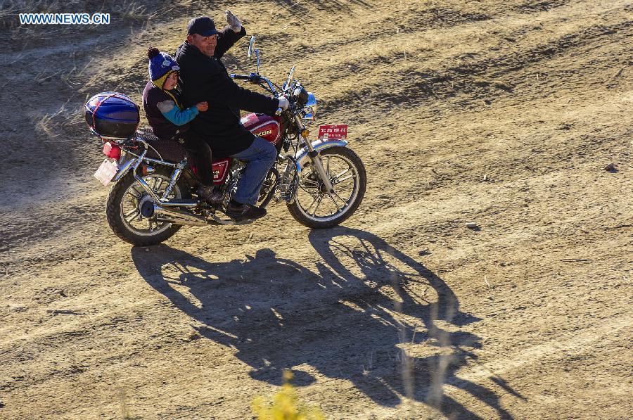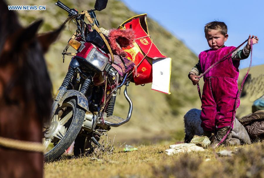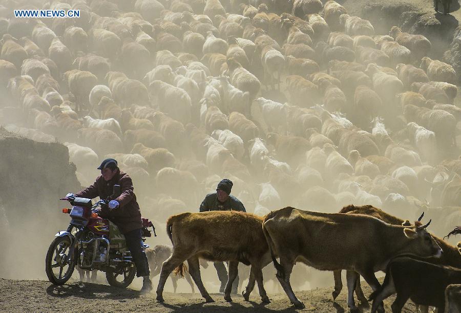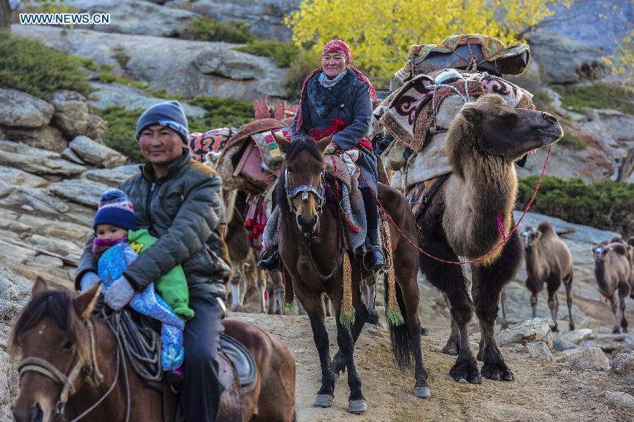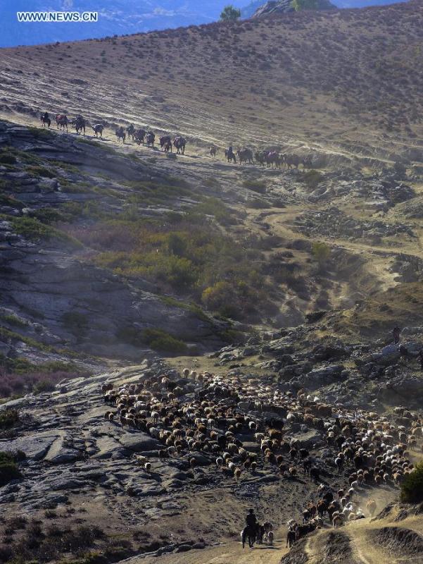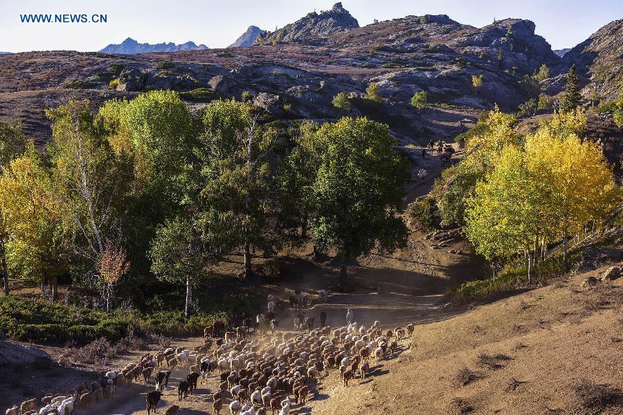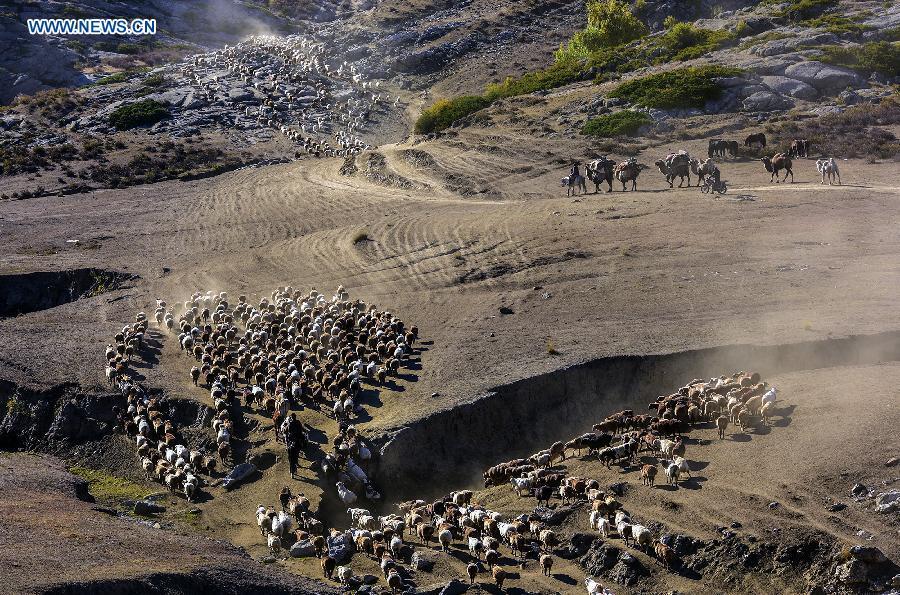 Photo taken on Sept. 17, 2015 shows herdsmen transferring their sheep and cows to winter pastures in Altay Prefecture of northwest China's Xinjiang Uygur Autonomous Region. As the summer has come to its end, local Kazak herdsman families here started to move their herds into winter pastures. (Photo: Xinhua/Shen Qiao)