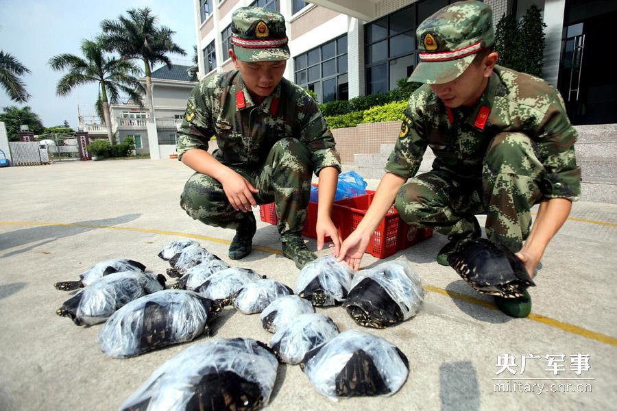 An officer holds one of the smuggled turtles in Shenzhen, South China's Guangdong province on Sept 20, 2015. Police in Shenzhen, South China's Guangdong province and their Hong Kong counterparts intercepted 282 smuggled turtles in a border area between the two cities. Experts say the turtles are likely to be an endangered species, although they still need confirmation. The reptiles were packed in 13 boxes intended to be smuggled into Hong Kong via the mainland city. The case remains under investigation. (Photo/cnr.cn)